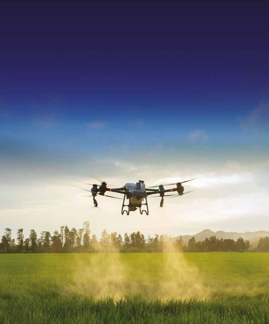 Este dron agrícola, de diseño compacto y gran potencia, facilita la pulverización y la dispersión de sólidos en terrenos irregulares o con obstáculos, así como en zonas después de las lluvias.