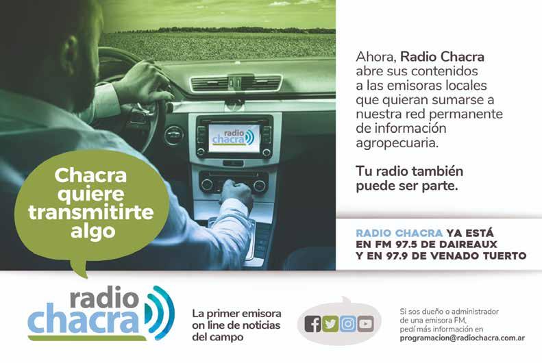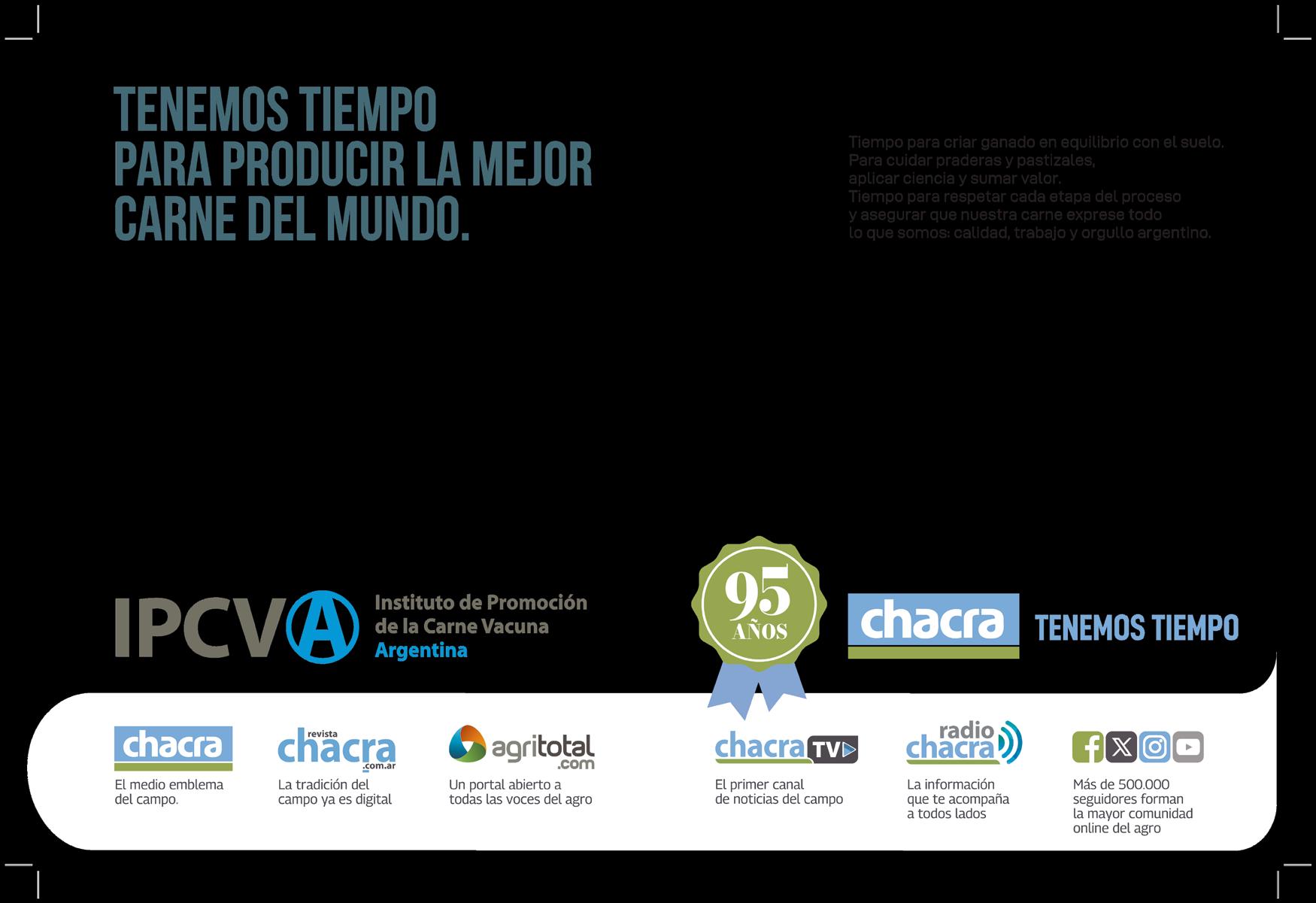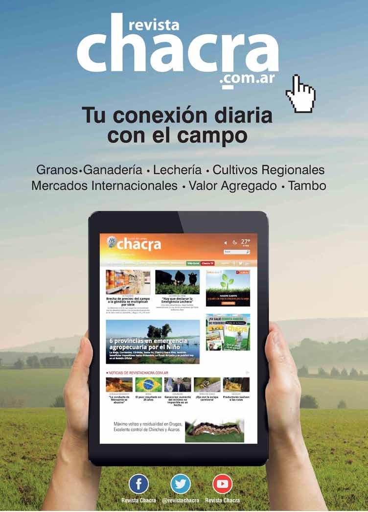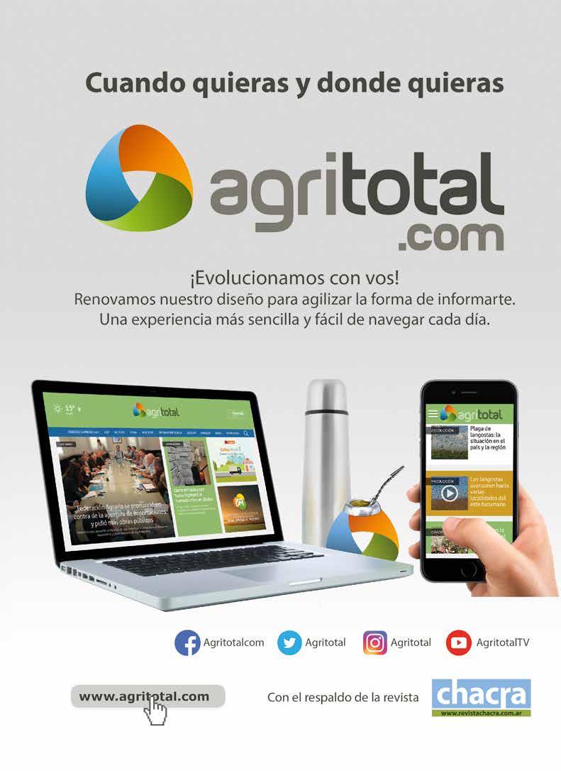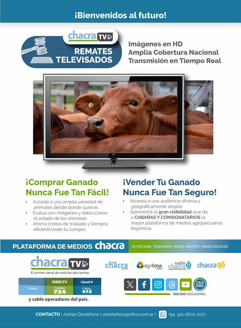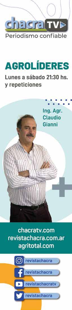CHACRA & CAMPO MODERNO. Fundada en noviembre de 1930, es propiedad de The New Farm Company S.A., Francisco Narciso de Laprida 1481 - Vicente López, Buenos Aires, Argentina. Tel. 011-5353-5090 al 94; PUBLICACIÓN MENSUAL. Precio del ejemplar en todo el país: $ 300,00. Recargo por envío al interior: $ 16,00. SUSCRIPCIONES. En el exterior con franqueo vía aérea certificado. Países limítrofes (Bolivia, Brasil, Chile, Paraguay, y R. O. del Uruguay) y Perú: 1 año (12 números) USD 170 -Resto de América: USD 250- Europa: USD 270 - Asia, África y Oceanía: USD 270- Distribuidora en Capital Federal y Gran Buenos Aires: Huesca-Distribuidora de Publicaciones S.A., Aristóbulo del Valle 1556, Cap. Fed. Distribuidor en el interior del país: Transpres S.A., Isabel La Católica 1371, Cap. Fed. Registro Nacional de la Propiedad Intelectual 512 1483. Impresa en MARIANO MAS S.A. - México 649/651, San Telmo. Buenos Aires, Argentina - Teléfono: (+54 11) 4331-5764. Este medio se encuentra auditado por el Instituto Verificador de Circulaciones (IVC). PRINTED IN ARGENTINA. ISSN 0325-7932. Editor Responsable: RUBÉN O. BARTOLOMÉ. BUENOS AIRES - AGOSTO 2025 - AÑO 95 EDICIÓN Nº 1137