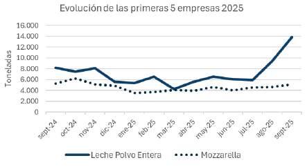 Por su parte, la mozzarella volvió a la zona de 4,5–5,0 mil t, con Molfino al frente y mejoras en CORLASA, Pampa Cheese, García Hnos. y Tonutti. El incentivo de precios es claro: en