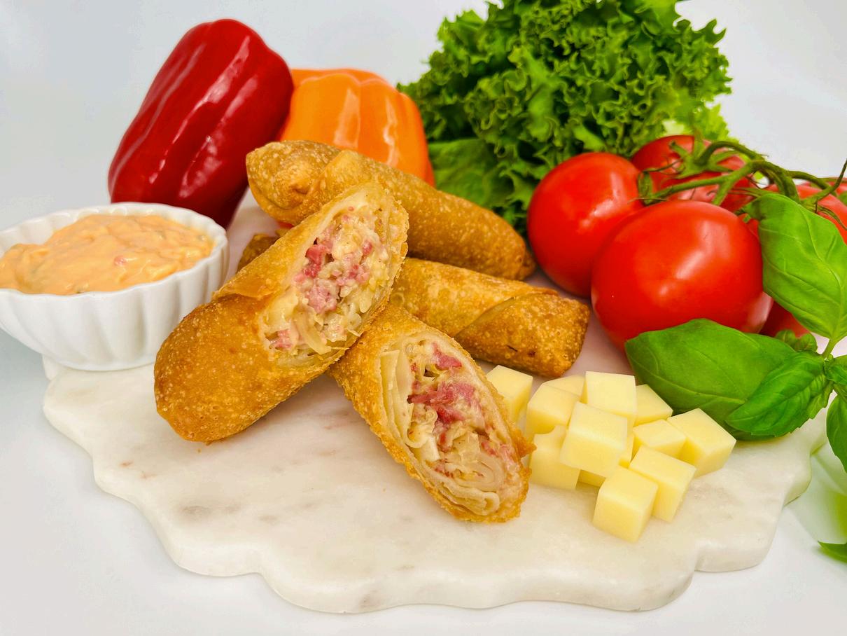 Perfect bar snack. Sliced Corned Beef filling, mixed with Swiss Cheese, Sauerkraut, 1000 Island Dressing with a hint of Ground Caraway in Egg Roll Wrap. Deep fried to crispy golden brown.