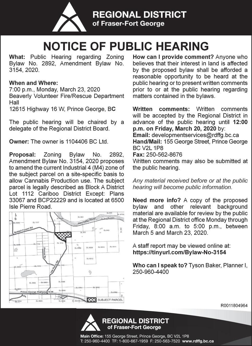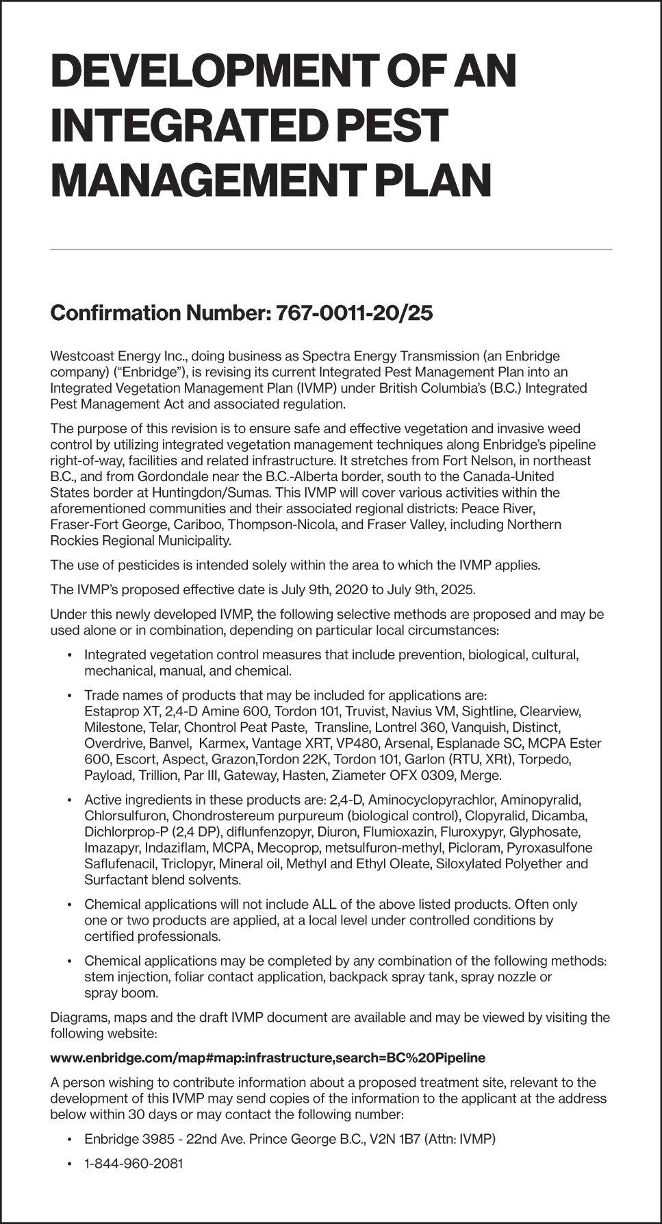 The geographical areas covered by this proposed IVMP overlap with Peace River Regional District, Fraser Fort George Regional District, Regional District of Bulkley-Nechako, Regional District of Kitimat-Stikine, and the District of Kitimat Specifically, these areas include locations near the communities of Dawson Creek, Fort St John, Groundbirch, Chetwynd, Prince George, Vanderhoof, Fraser Lake, Burns Lake, Houston, Smithers, Kitimat and Terrace The IVMP will apply to all components of the Project including the pipeline right-of-way, compressor and meter station sites, access roads and ancillary sites. The IVMP will be active from 2020 to 2025 Herbicide applications are intended within the areas to which the IVMP applies to control invasive and noxious weeds and undesirable vegetation