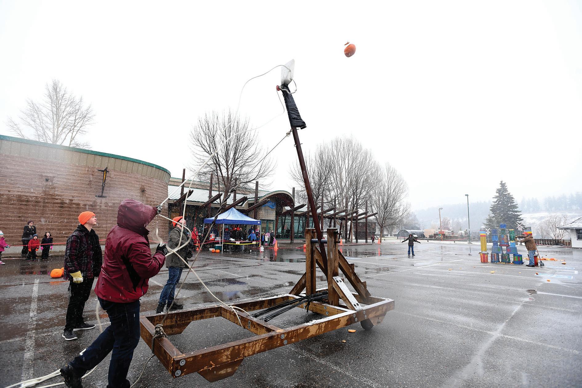 Staff members from The Exploration Place launch a pumpkin during the Annual Rotten Pumpkin Festival Thursday afternoon. For $2, people were able to watch their Halloween pumpkins meet a thrilling end. This year’s festival saw hundreds of pumpkins flung in the parking lot in front of the museum. The smashed pumpkins were collected and composted after the event.