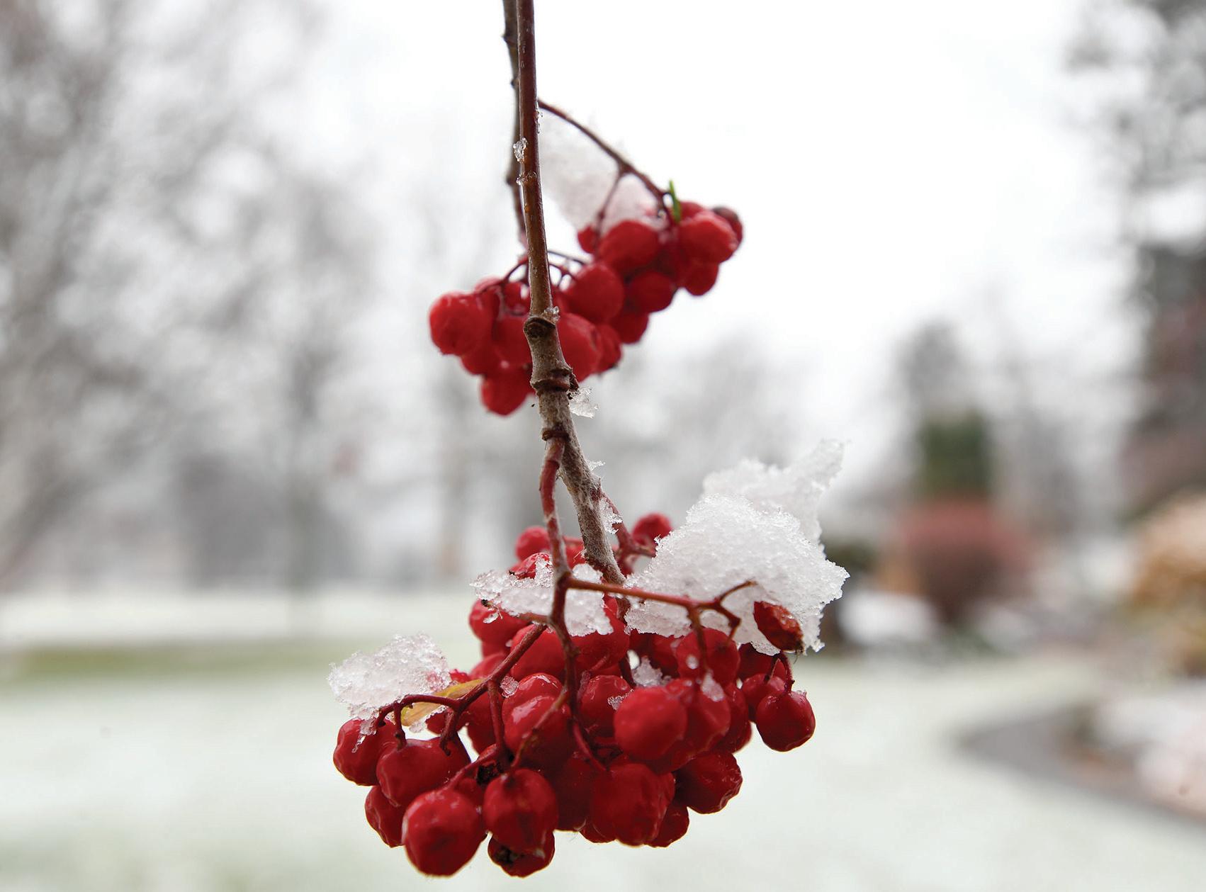 Snow clings to a mountain ash tree in Lheidli T’enneh