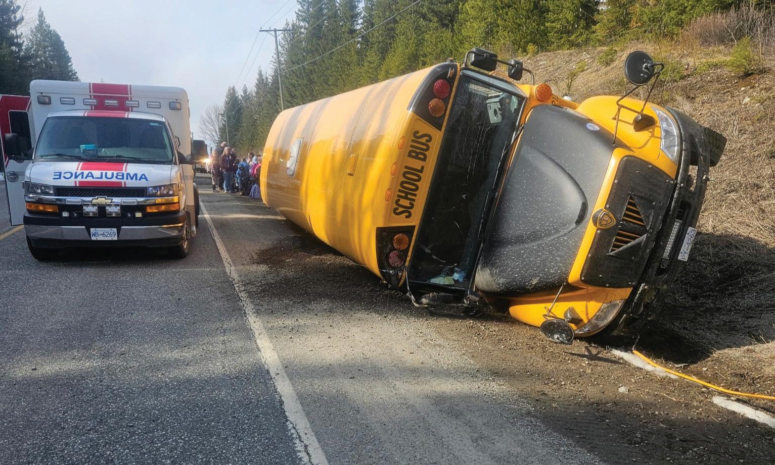 Three Barlow Creek Elementary School students were transported to an area hospital with minor injuries following a school bus rollover that occurred on the highway to Barkerville just east of Quesnel on Monday, March 30. The Barlow Creek Volunteer Fire Department reported the accident occurred after the bus veered to the lefthand side of the road into a ditch, where it slowly rolled on its side. ‘We were just lucky that it was a nice quiet day and we didn’t have any serious injuries,’ said fire Chief David Sugden. ‘A couple of bruises and bumps, but other than that everybody was visibly shaken quite badly, but they’ll all be fine. They are all going home.’ The cause of the crash is being investigated.
