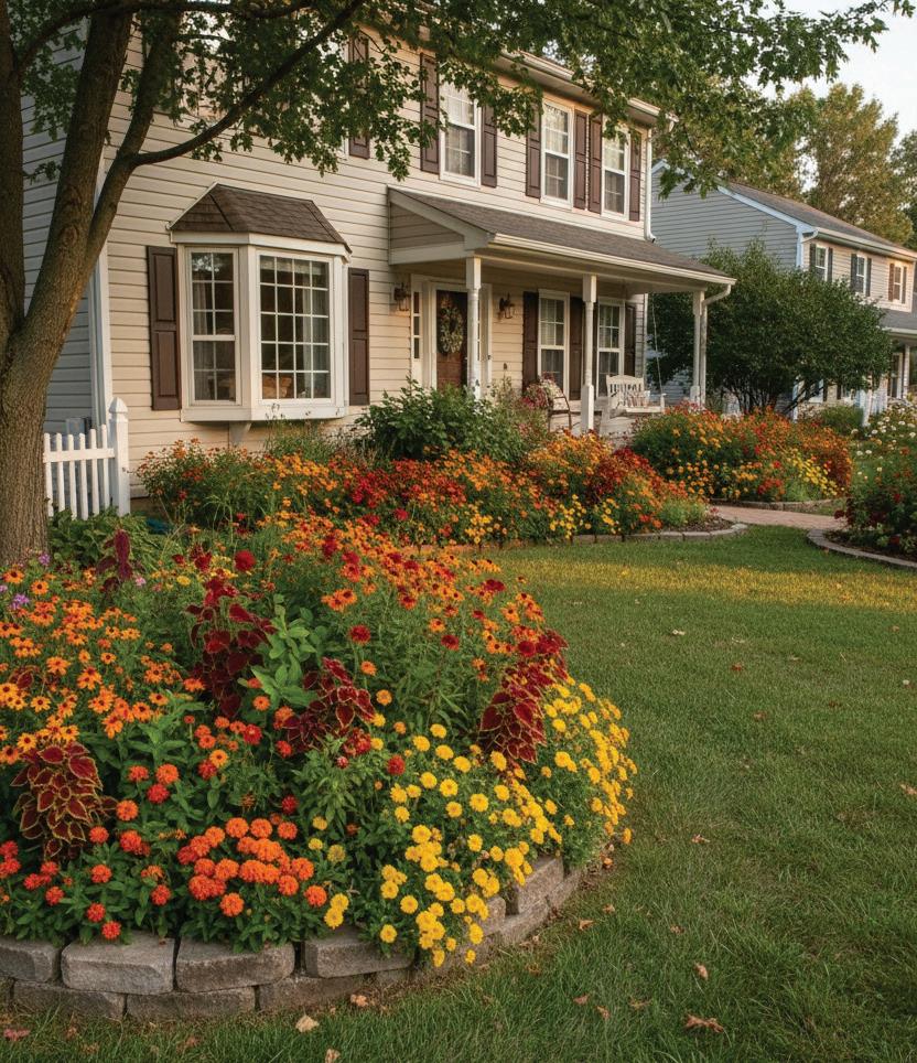 Warm colours can also be effective when used sparingly. Yellow flowers, such as marigolds, coreopsis, or yellow calibrachoa, add a cheerful pop that draws the eye toward the front entrance. Yellow is associated with happiness and warmth, making it ideal near doorways, walkways, and porch planters. Use reds and oranges carefully, as they are powerful colours that can feel aggressive if overdone. If used, limit them to small accents rather than large beds.