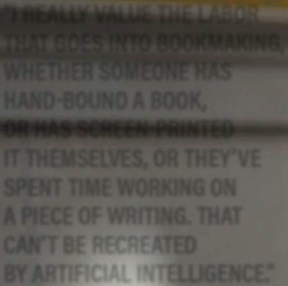 “I REALLY VALUE THE LABOR THAT GOES INTO BOOKMAKING, WHETHER SOMEONE HAS HAND-BOUND A BOOK, OR HAS SCREEN-PRINTED IT THEMSELVES, OR THEY’VE SPENT TIME WORKING ON A PIECE OF WRITING. THAT CAN’T BE RECREATED BY ARTIFICIAL INTELLIGENCE.”
