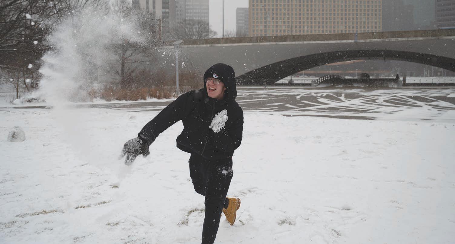 Teddy Malinowski, a student at Point Park University, throws a snowball at friends on Jan. 6, 2025.
