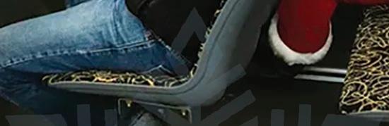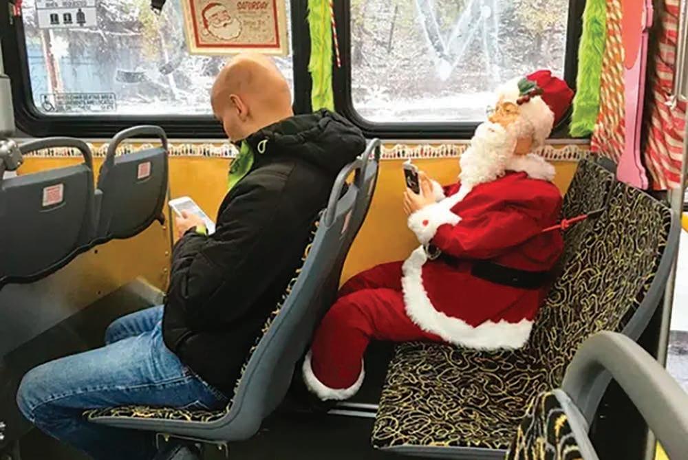 A lifesize Santa doll on a Pittsburgh city bus decorated for the holidays
