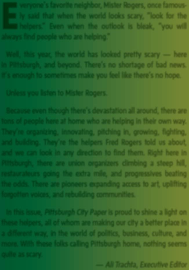 In this issue, Pittsburgh City Paper is proud to shine a light on these helpers, all of whom are making our city a better place in a different way, in the world of politics, business, culture, and more. With these folks calling Pittsburgh home, nothing seems quite as scary.