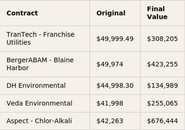 That’s fifty-one cents below the $50,000 threshold at which state law requires the Port of Bellingham to document competitive solicitation for professional services. The contract, awarded to TranTech Engineering in 2018 for Waterfront Franchise Utilities work, then grew to $308,205 –more than six times its original value.