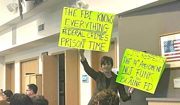 s Donna McGaffic holds up signs referencing a CJTC investigation into multiple Blaine Police Department officers, including Chief Rodger Funk, during the January 26 Blaine City Council meeting.
