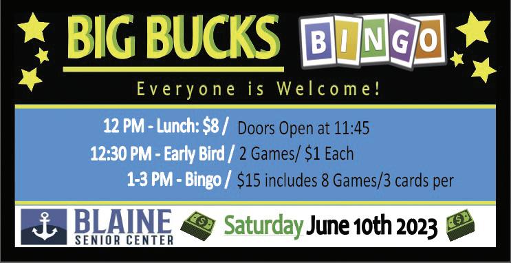Meals on Wheels Hot Lunches: Monday–Friday, 11:30 a.m.–2:30 p.m., Blaine Senior Center, 763 G Street. Suggested donation of $5 per meal ($8.50 if under 60) or whatever is affordable. First come, first serve basis. Info: 360/332-8040.