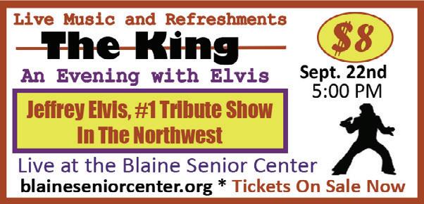 The King: An Evening with Elvis: Friday, September 22, 5 p.m., Blaine Senior Center, 763 G Street. Enjoy live music by Jeffrey Elvis, the number one Elvis tribute show in the northwest. Tickets: $8. Reservations required. Info: blaineseniorcenter.org.
