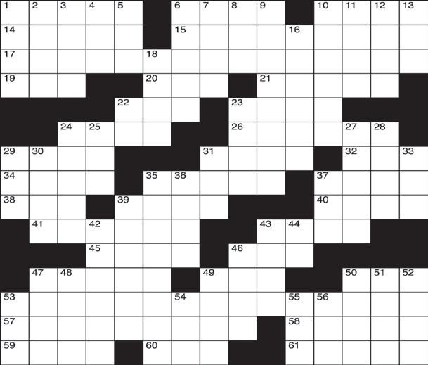57. Quality of being imaginary 58. Far-right German party 59. Drove 60. Former French coin of low value 61. Hard, durable timbers DOWN
