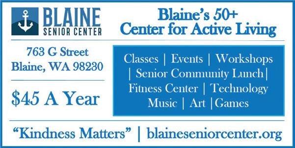 Senior Community Meals: Monday–Friday, 11:30 a.m.–12:30 p.m., Blaine Senior Center, 763 G Street. Suggested donation of $5 per meal ($8.50 if under 60) or whatever is affordable. First come, first serve basis. Info: 360/332-8040.