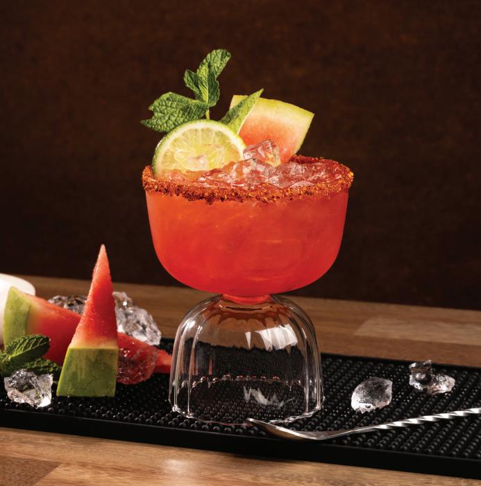 Fill prepared glass with ice and pour watermelon mixture into glass.