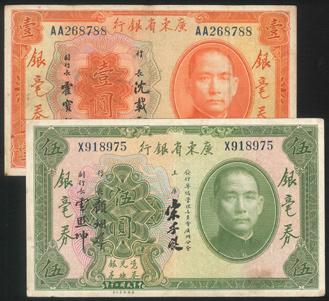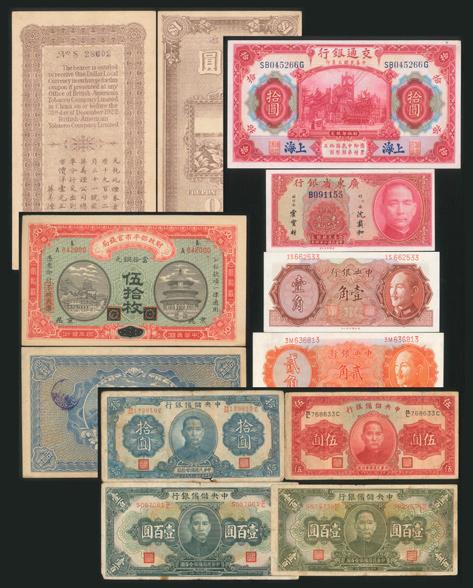 1 1931 The Kwangtung Provincial Bank $1 and $5, VF-EF (2). 民國二十年廣東省銀行銀毫券壹圓伍圓各一 HK$300 2 1914//1940 Republic Period Banknote Selection, group of ten, including various various banks and private local currency coupon etc (10). 民國時期紙鈔,財政部銅元票,英美煙公司壹圓券,交通 銀行及中央儲備銀行 HK$500