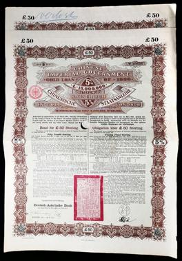 Stocks & Bonds 股票債券 14 China: 1896 Chinese Imperial Government Gold Loan £50, a pair (2). 1896年大清政府50英鎊金債券兩張 HK$600 15 China: 1910 Deutsch-Asiatische Bank Tientsin-Pukow Railway £20, five coupons remaining. 大清宣統二年天津至浦口鐵路二十英鎊債券,餘下五張領 息券 HK$300 16 China: 1926 Nationalist Government Lottery Loan $5, signed by Chairman WANG Ching Wai in Chinese on front and English on reverse. 民國十五年國民政府財政部有獎公債伍圓,國民政府委員 主席汪精衛中文在正面及英文簽名在背面 HK$100 17