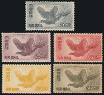 Japan: 1950.01.10 (January 10) Southern Green Pheasant Air Mail Issue (Scott C9-13), complete set of five, light tropical gum toning, UM (5). 日本第二套航空票一套五枚,原膠,輕微泛黃 HK$500