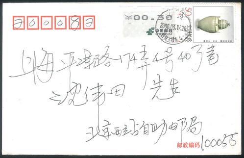637 ✉ 2000.03.17 (March 17) Beijing to Shanghai Meter Mail, franked with 50f stamp and 30f meter stamp, a short lived example as usage of the self service meter machine imported from Germany in Late December 1999 was stopped in 2001 due to constant malfunction.