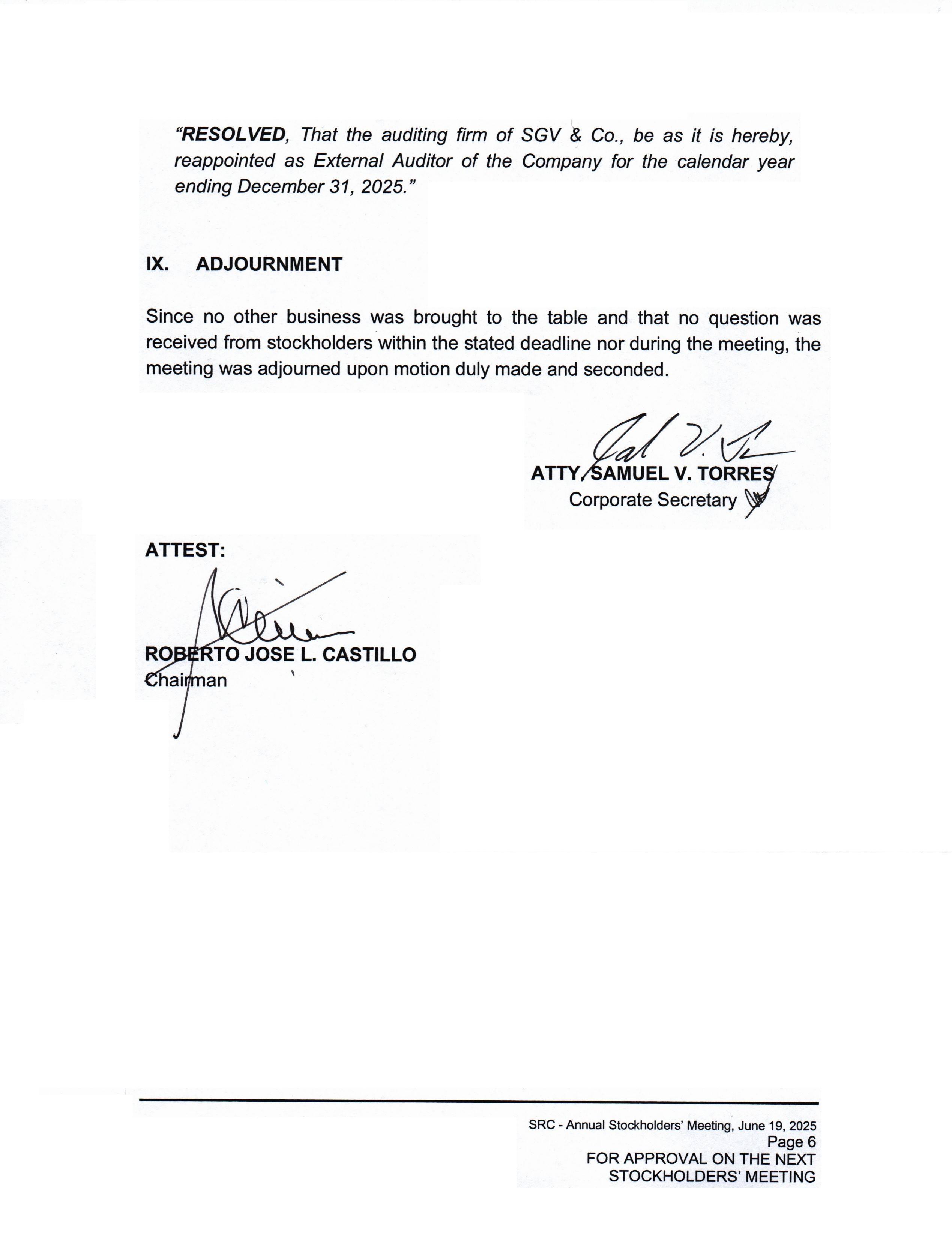 SRC - Annual Stockholders’ Meeting, June 19, 2025 Page 2 FOR APPROVAL ON THE NEXT STOCKHOLDERS’ MEETING