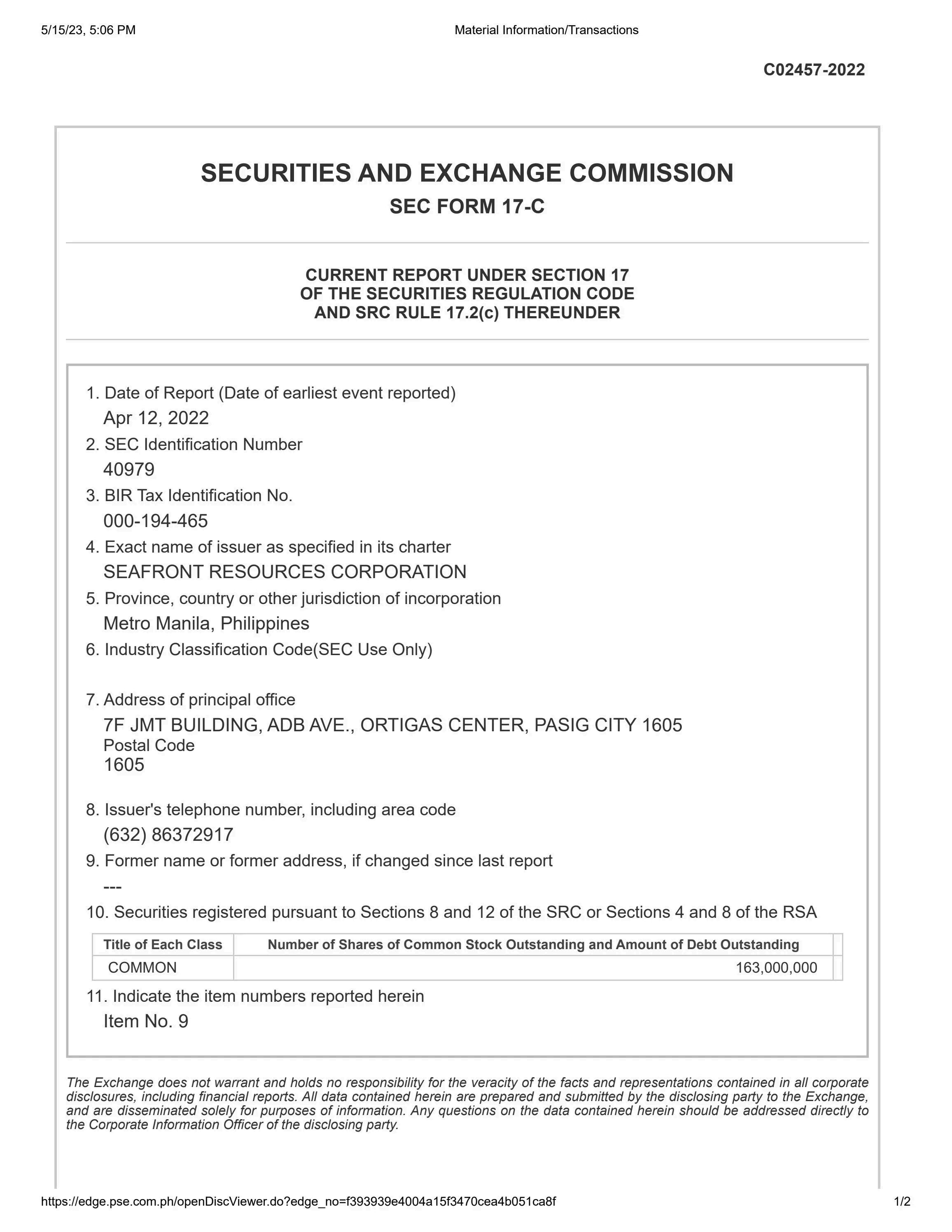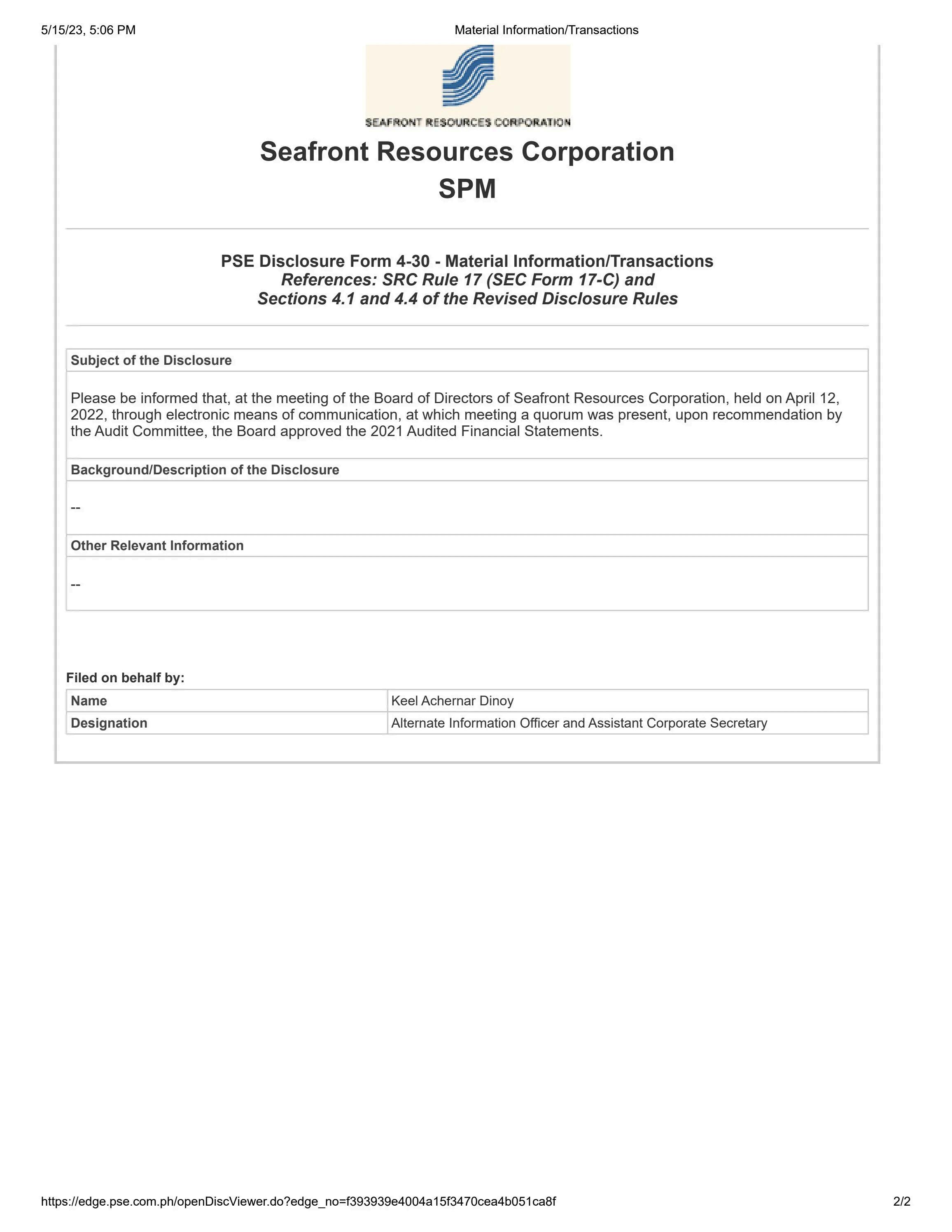 Material Information Transaction 2022