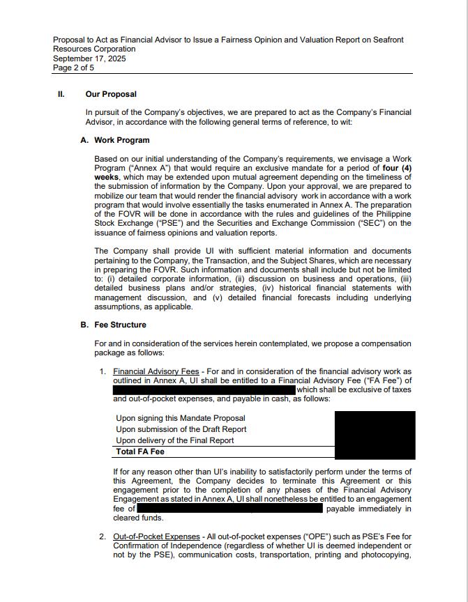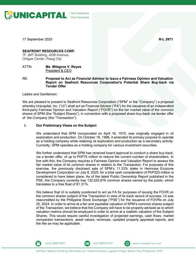 This is to advise you that SEAFRONT RESOURCES CORPORATION (the “SPM” or the “Company”) intends to acquire through a voluntary tender offer pursuant to Section 19 of the Securities Regulation Code (the “Tender Offer”), the shares owned by the investing public. The subject of this Tender Offer is Thirty Four Million Five Hundred Eighty Thousand (34,580,000) common shares of stock of SPM, representing Twenty One and Twenty One Hundredths percent (21.21%) of the outstanding common shares (the “Tender Shares”), at a price of Two Pesos and Seventy Centavos (₱2.70) per share, or an aggregate price of Ninety Three Million Three Hundred Sixty-Six Thousand Pesos (₱93,366,000.00).