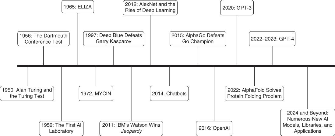 These milestones, among many others, represent key moments in the development of AI, each marking a significant stride forward in the technology’s capabilities. Let’s explore the milestones illustrated in Figure 1-1.