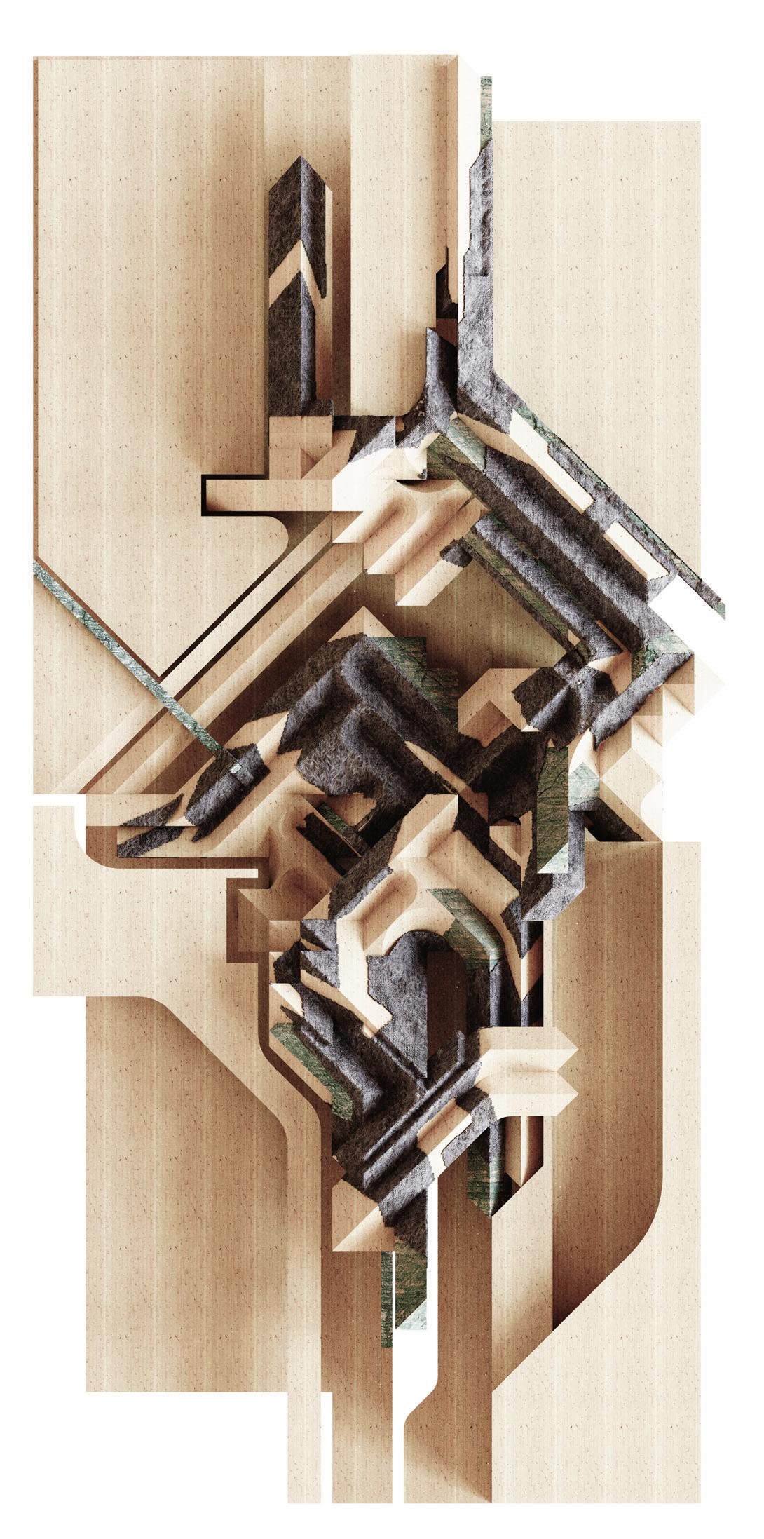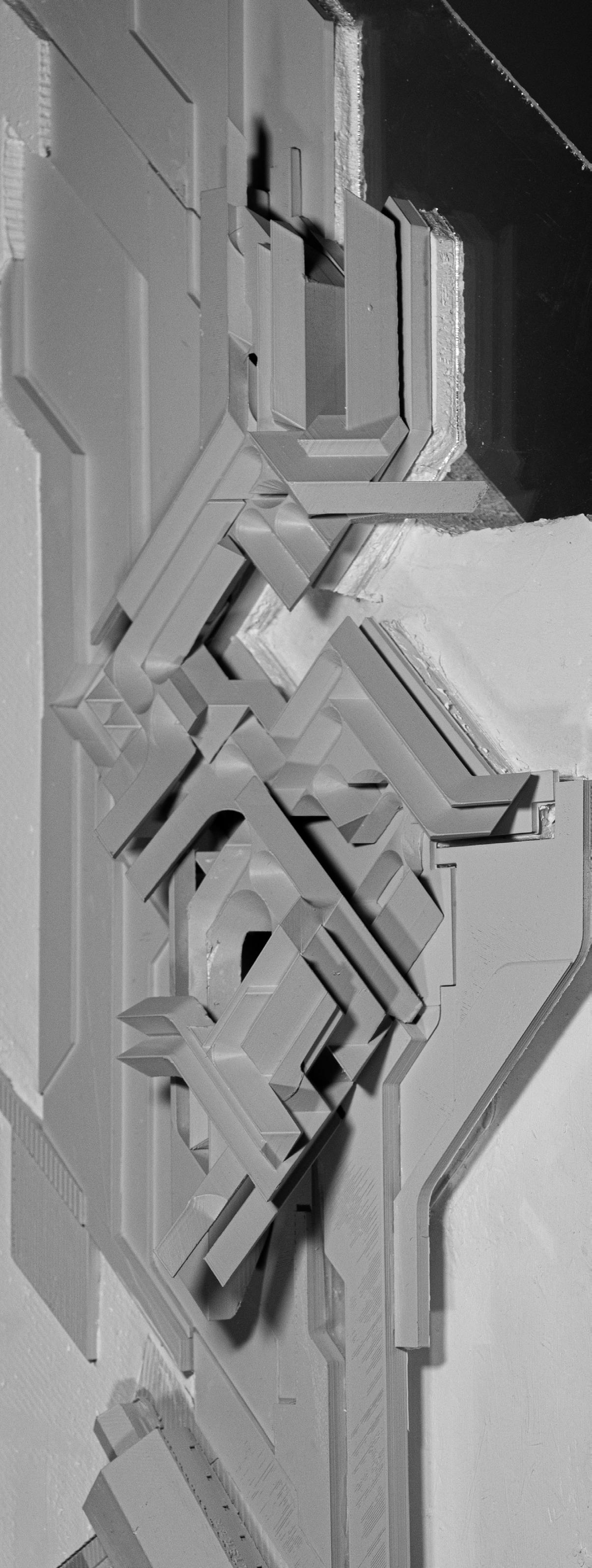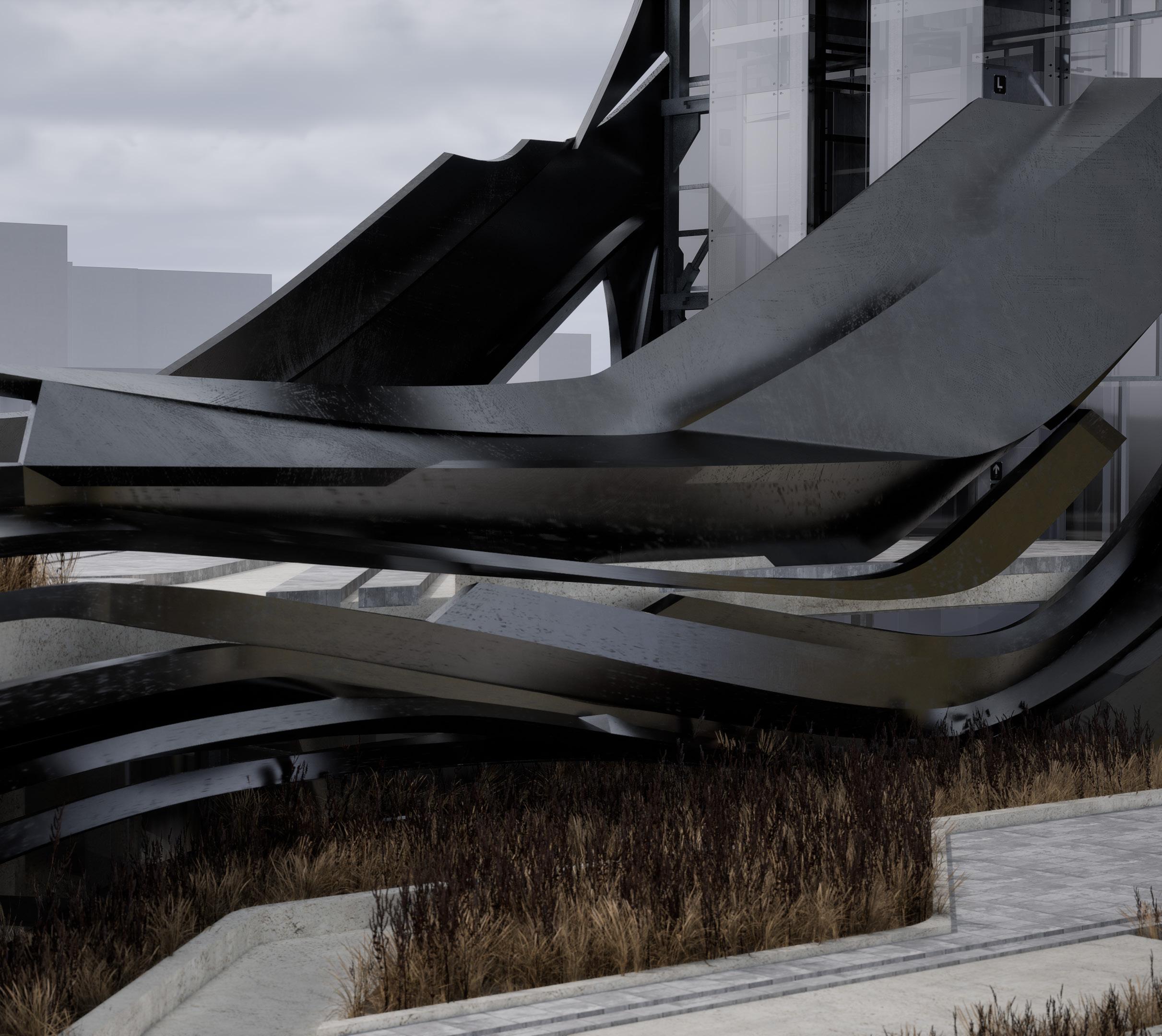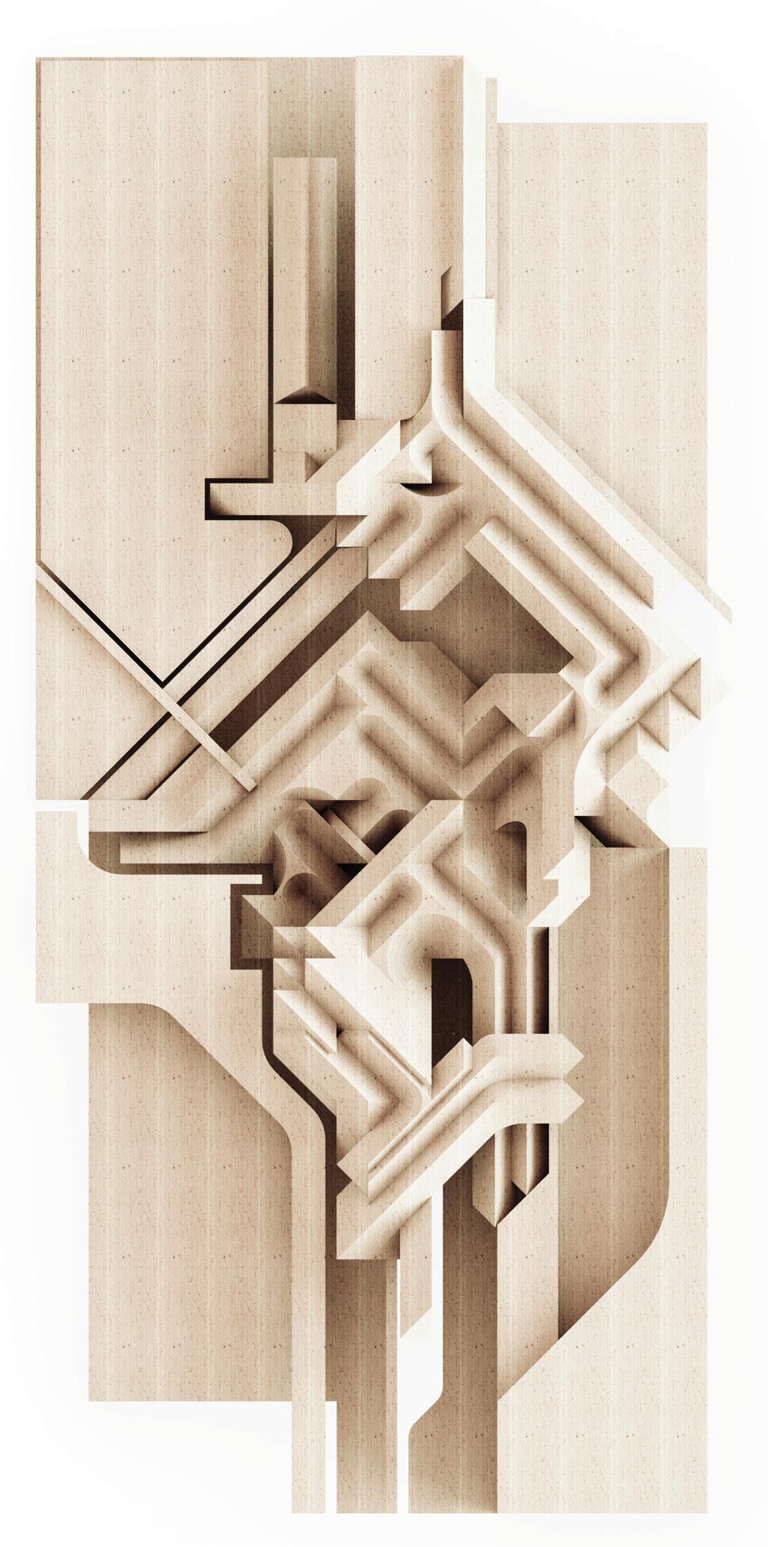 This sculptural design originates from the rotation and extension of tetrahedral geometries, emphasizes precision and material expression, with layered surfaces that generate a sense of movement and transformation. This exploration serves as a conceptual foundation for the subsequent architectural design, where the sculptural language evolves into spatial experiences.