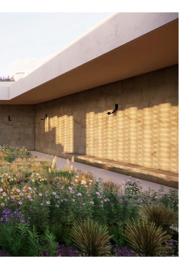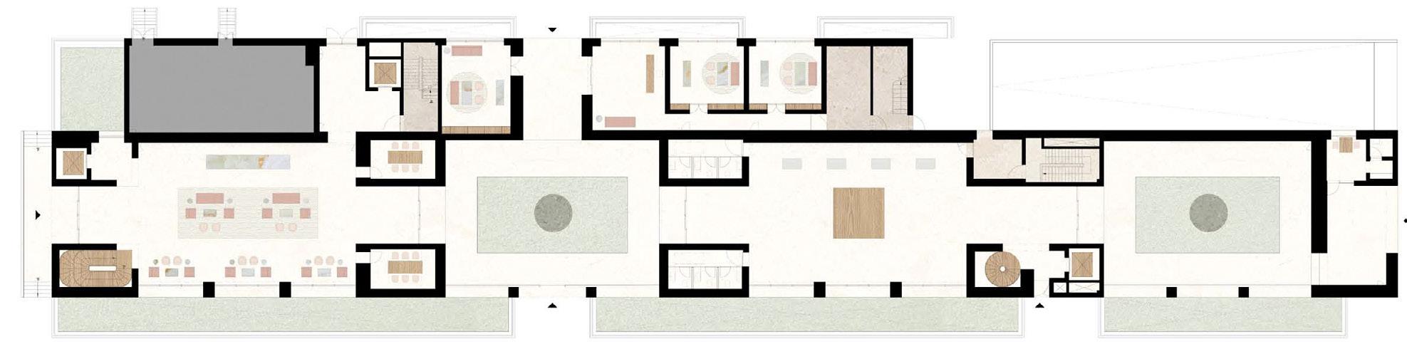 The courtyard is not just an element of transit but the most poignant expression of the building's ethos— where the built environment and nature are not just adjacent but are in conversation. It is here that the journey through the building becomes an experience, not just a route, encouraging a moment of reflection in the embrace of natural bright warmth, the soft touch of limestone, and the dance of shadows, crafting an everchanging, yet timeless, space.