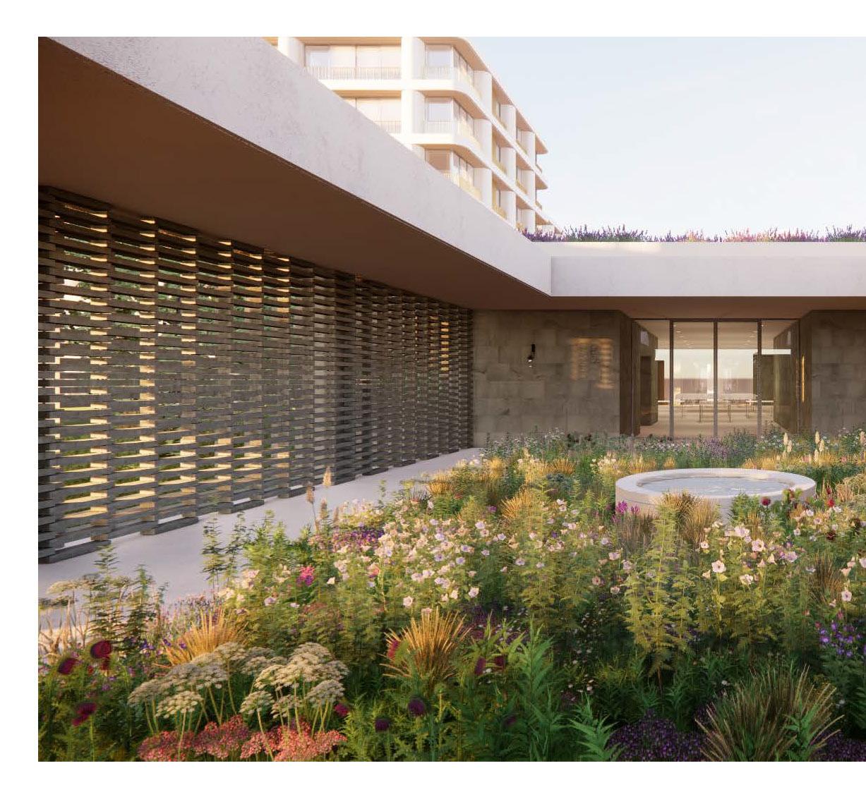 Nestled within the embracing arms of modern architecture, the courtyard serves as the vital nucleus of the residential complex—a dynamic thoroughfare for residents and visitors alike. It's a deliberately crafted sanctuary where the rigidity of stone and concrete yields to the organic tapestry of a vibrant garden. This space is alive with a spectrum of flowers and grasses that sway to the rhythm of passing breezes, anchored by a tranquil circular water feature that whispers serenity into the surroundings.
