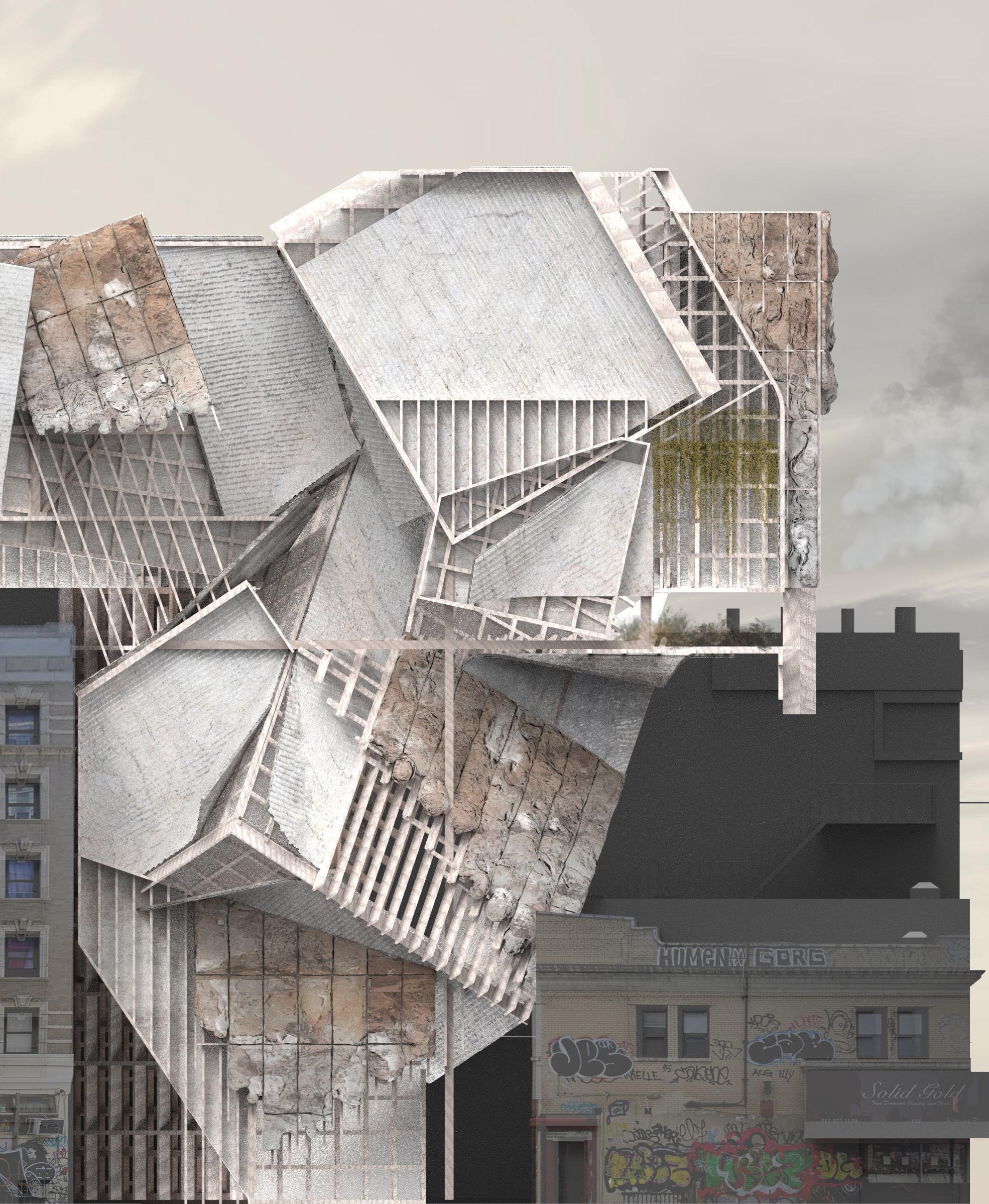 In juxtaposition, the 3D-printed stone is a testament to transience, a material deliberately selected to exhibit the signs of weathering and the relentless march of time. This innovative material choice is not only about aesthetic appeal but also about creating a living architecture that evolves. Small steps and intentional gaps within the stone elements become fertile grounds for natural occurrences such as the sprouting of weeds and the growth of moss, turning the structure into a canvas that captures the essence of decay and rebirth in its crevices and contours.