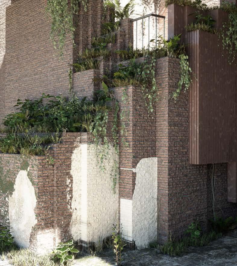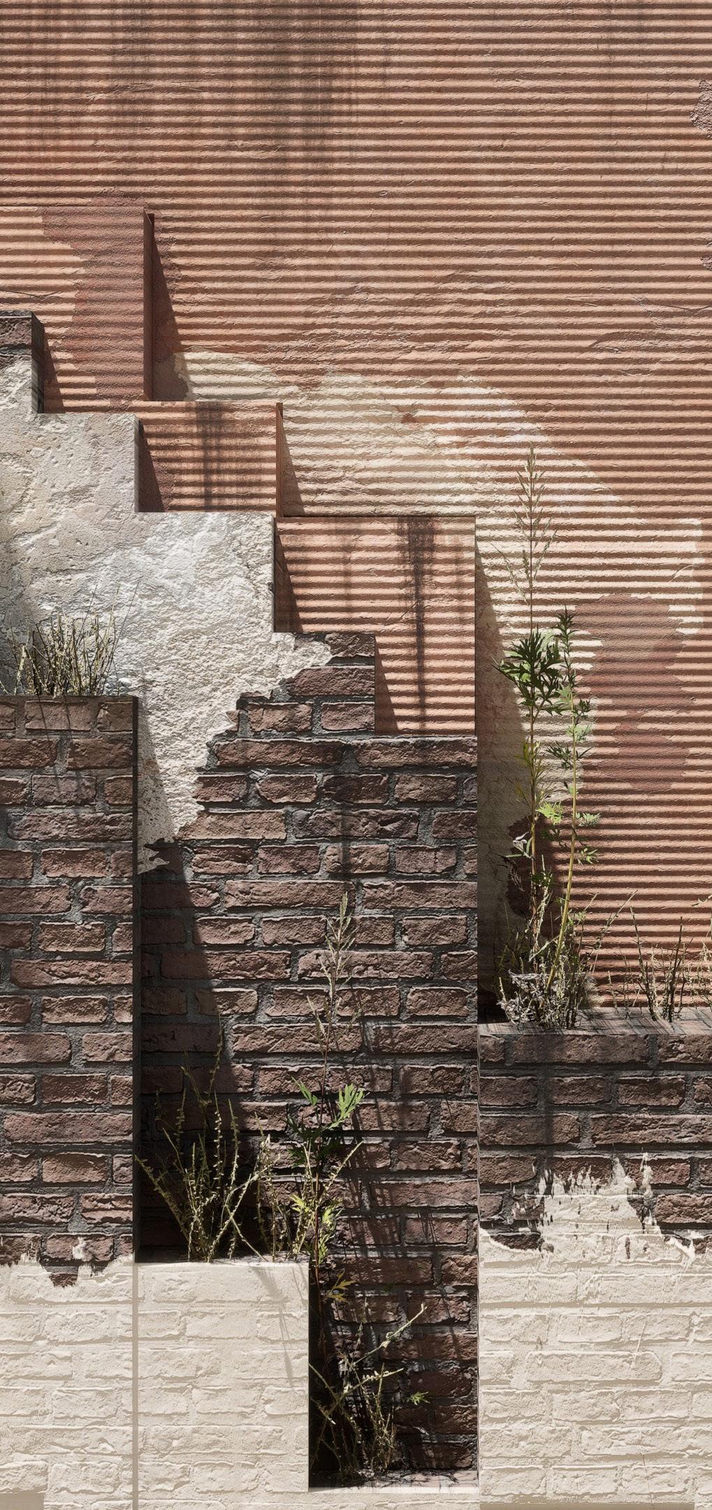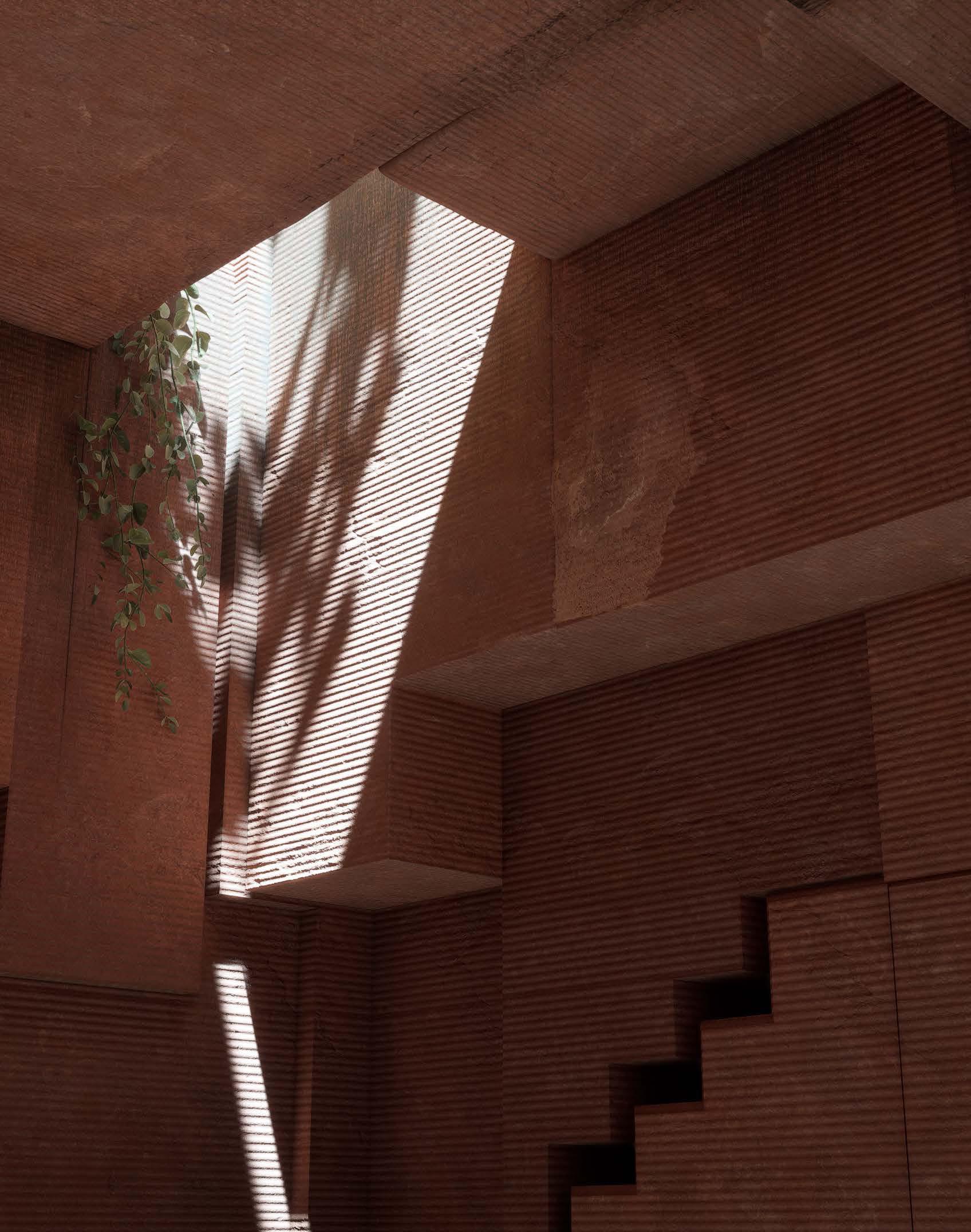The use of 3D-printed stone, tinted with the distinctive orange hues reminiscent of Bologna, introduces a subtle variance in coloration that adds depth and vibrancy to the structure. In a seamless transition, sections of this stone descend to meet the brickwork, continuing the stepping motif that is central to the design language of the project. This stepping is not just a visual element but also a practical one, as it allows the architecture to respond dynamically to different ground levels and the associated spatial experiences.