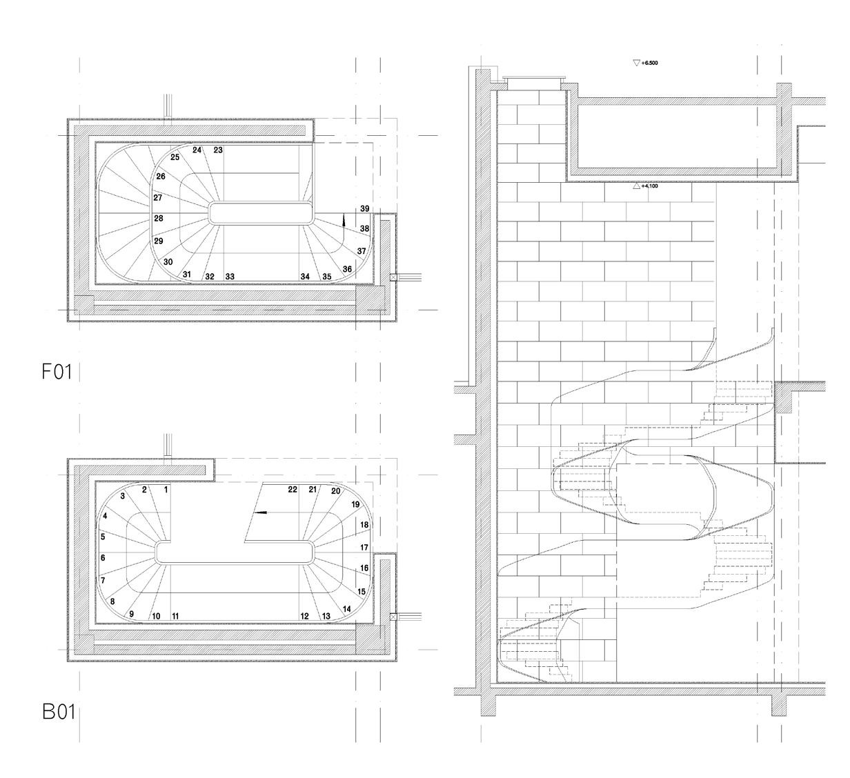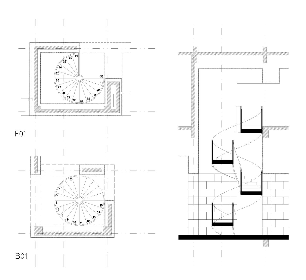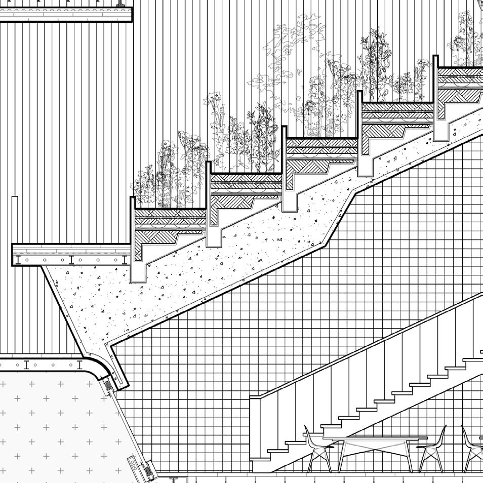 The use of 3D-printed stone, tinted with the distinctive orange hues reminiscent of Bologna, introduces a subtle variance in coloration that adds depth and vibrancy to the structure. In a seamless transition, sections of this stone descend to meet the brickwork, continuing the stepping motif that is central to the design language of the project. This stepping is not just a visual element but also a practical one, as it allows the architecture to respond dynamically to different ground levels and the associated spatial experiences.