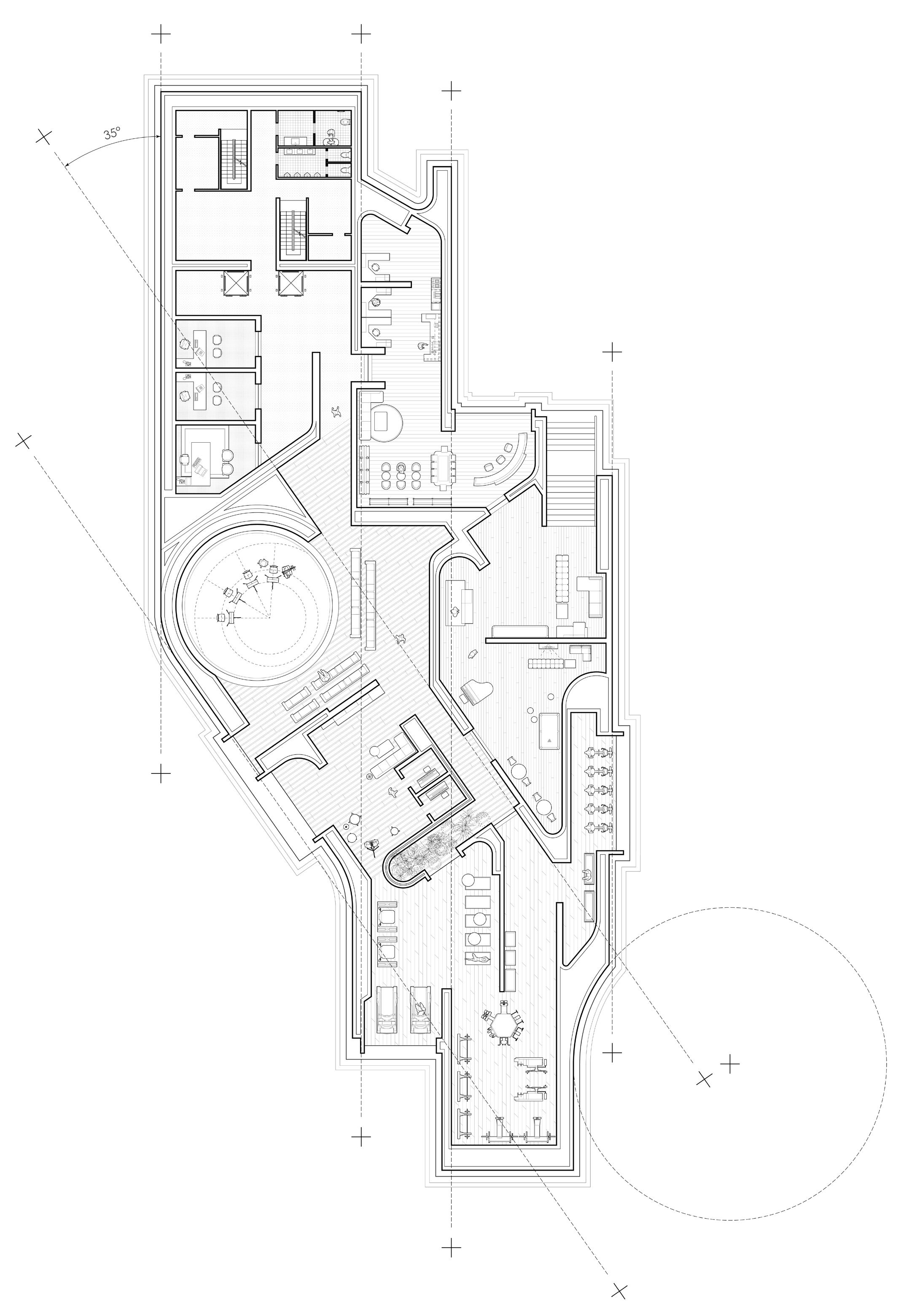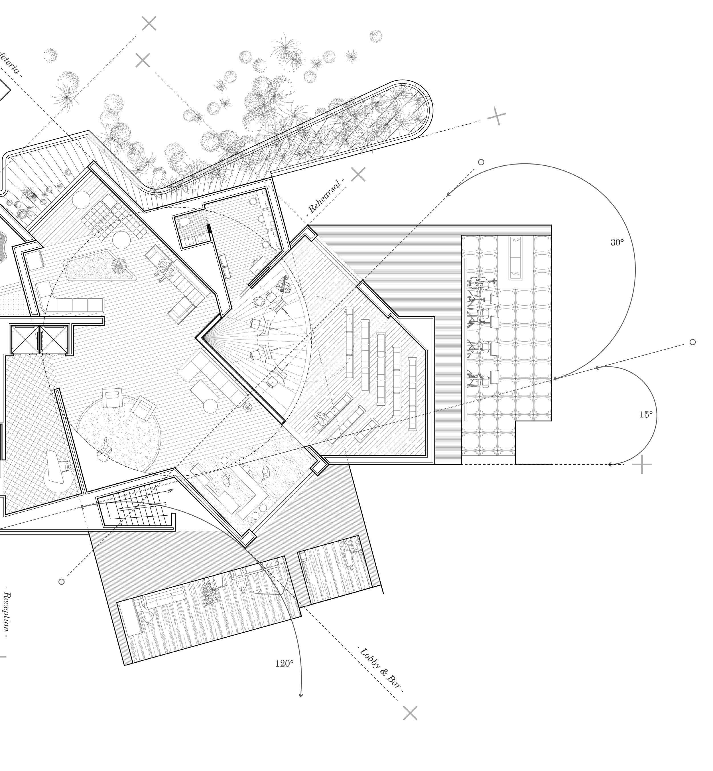 The architectural framework emerges as an extension of the graphic logic, transforming abstract gestures into structured space. Simultaneously, the functional organization is shaped by a detailed study of musicians’ lifestyles, ensuring that the residence not only embodies artistic expression but also supports the rhythms of creative work, rehearsal, and rest.