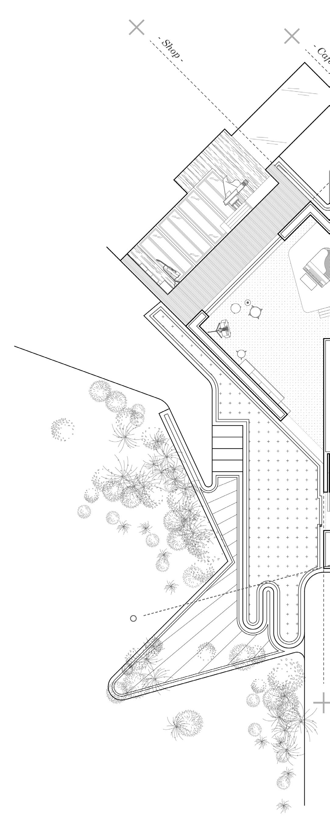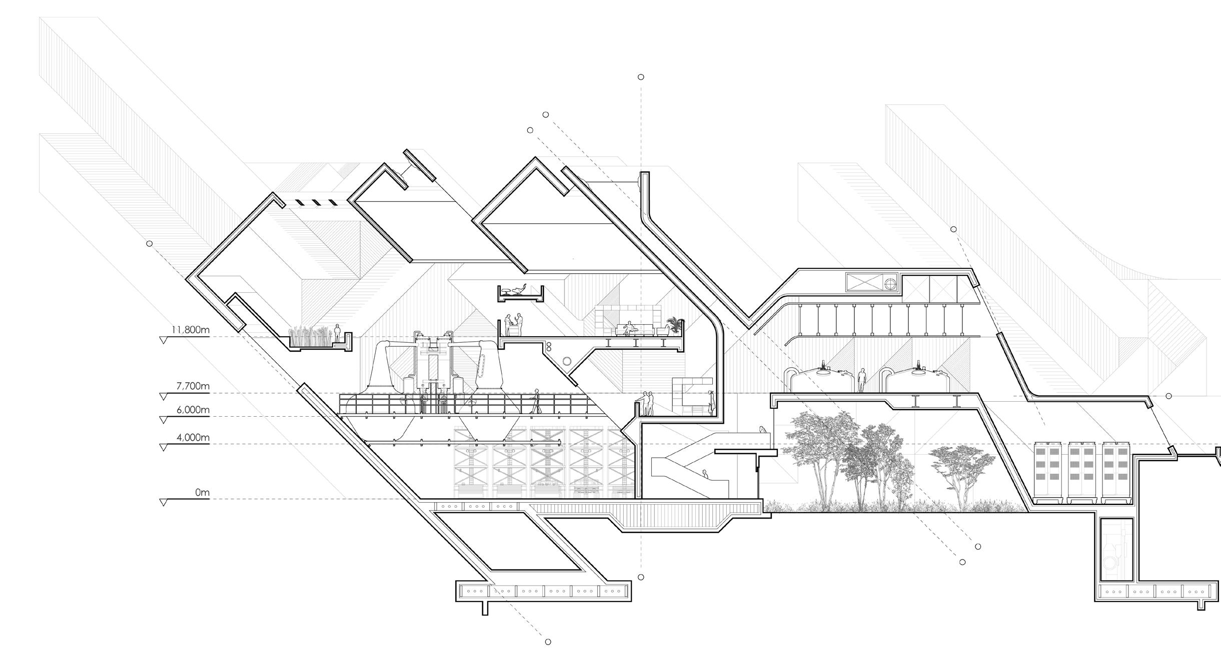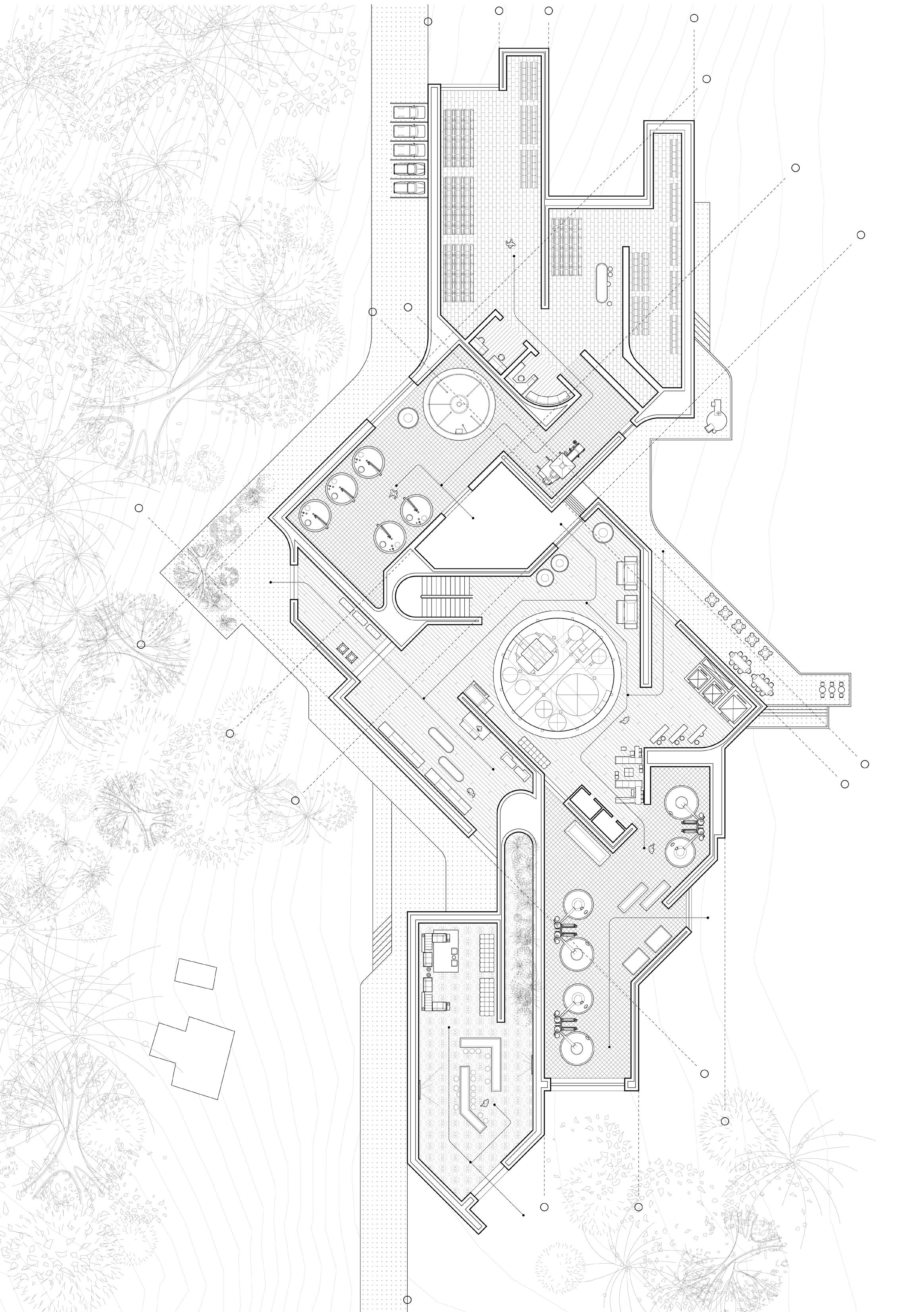 The project's site plan ingeniously tucks the entrance on a deeper side, ensuring harmony with nearby structures while inviting visitors on a secluded journey through verdant spaces. This intentional pathway amidst greenery aligns with the building's ethos of fostering a deeper connection with our food sources, subtly immersing visitors in nature before they even enter. By navigating through this green corridor, guests are primed for an intimate experience, resonating with the project's core message: understanding and respecting the lifecycle of food.