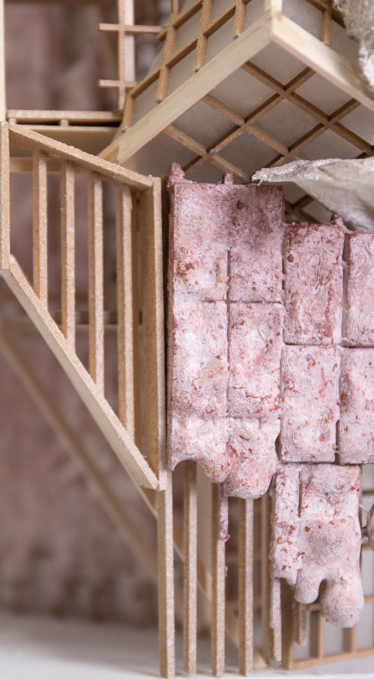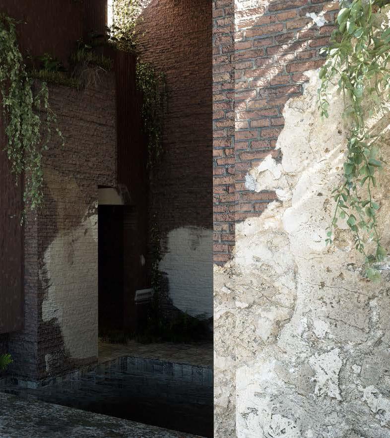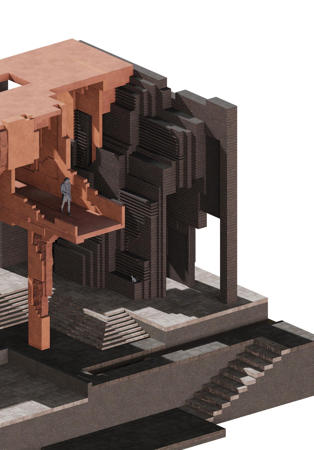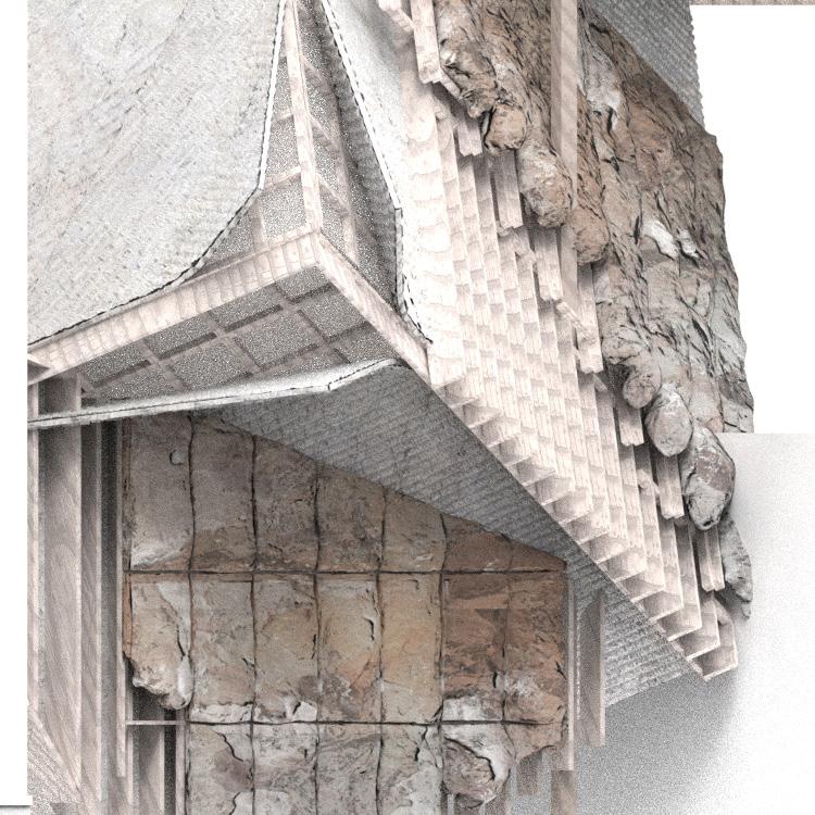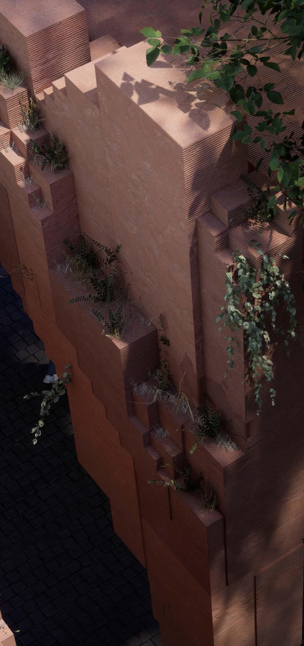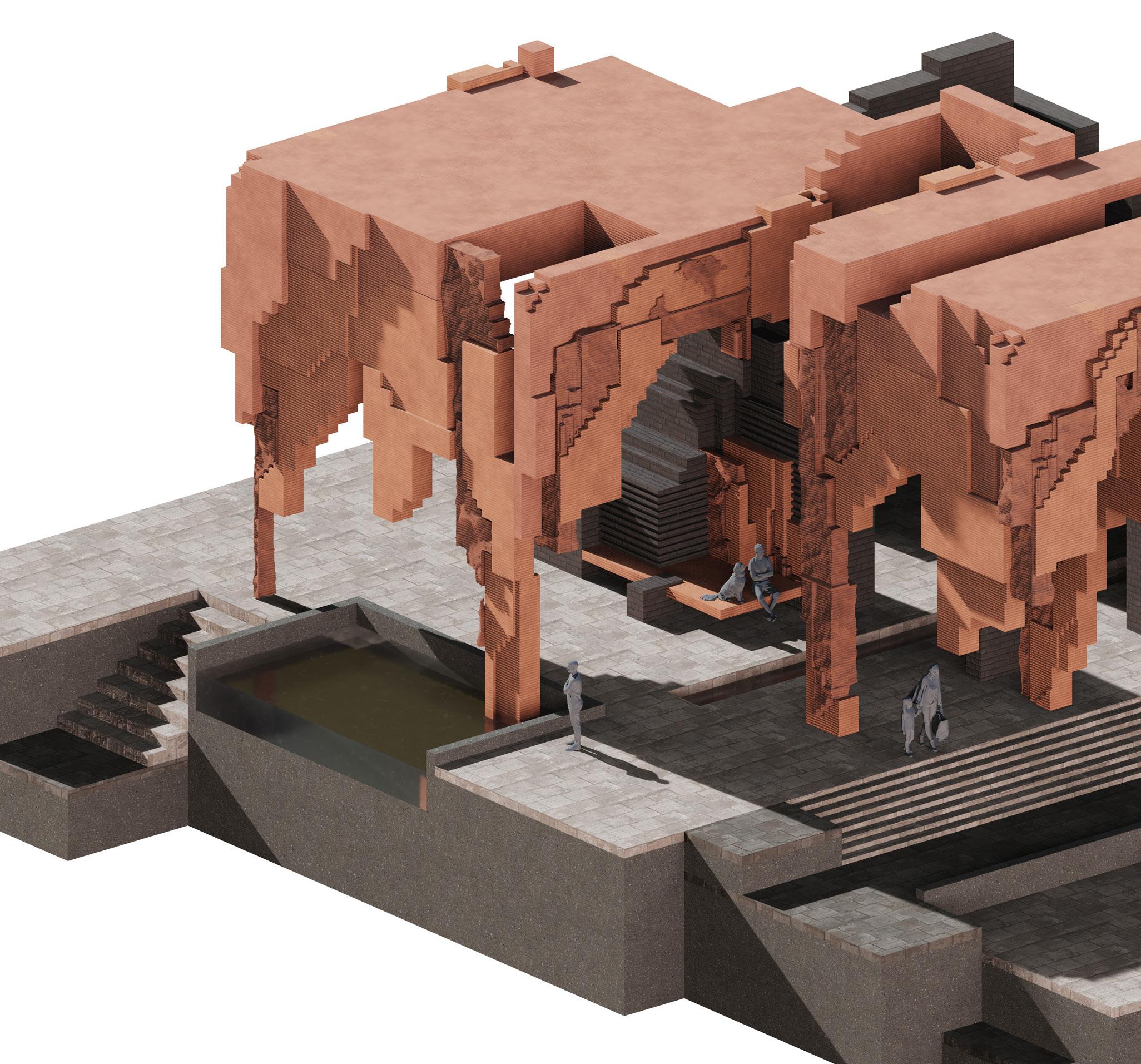 The project's material dichotomy serves as a narrative on the temporal nature of architecture, contrasting the enduring solidity of brick with the ephemeral qualities of 3D-printed stone. The bricks, resonant with the steadiness of tradition, form the foundational backbone of the structure, suggesting permanence and resilience. These bricks are chosen for their time-honored reliability and the way they anchor the entire design in a sense of historical continuity.