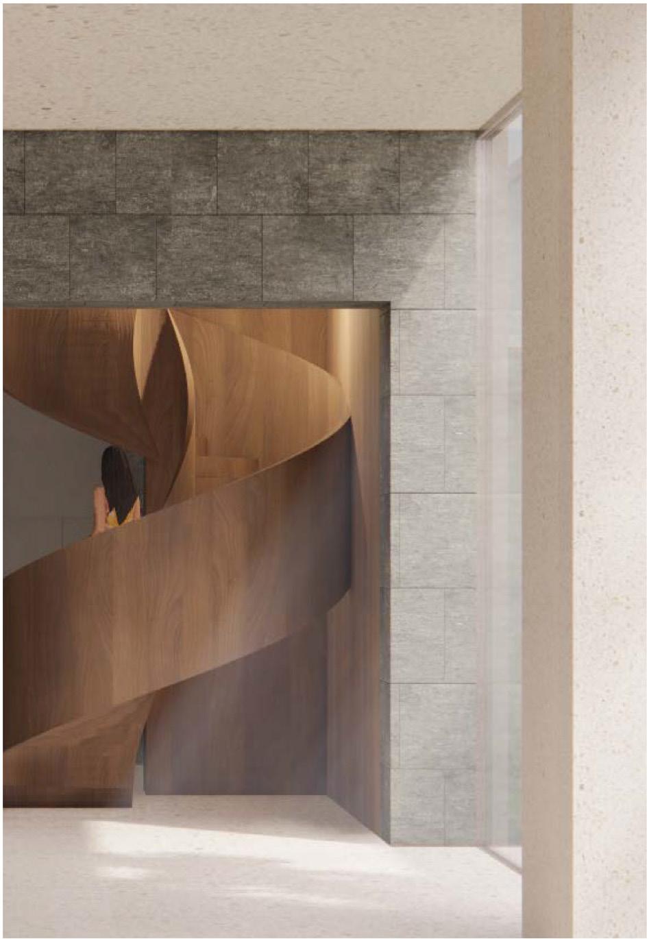 Constructed with a combination of CLT and marble, the entrance plays with exposure and concealment. The contrast between the warmth of wood and the cold solidity of stone reinforcing the sublime through material juxtaposition.