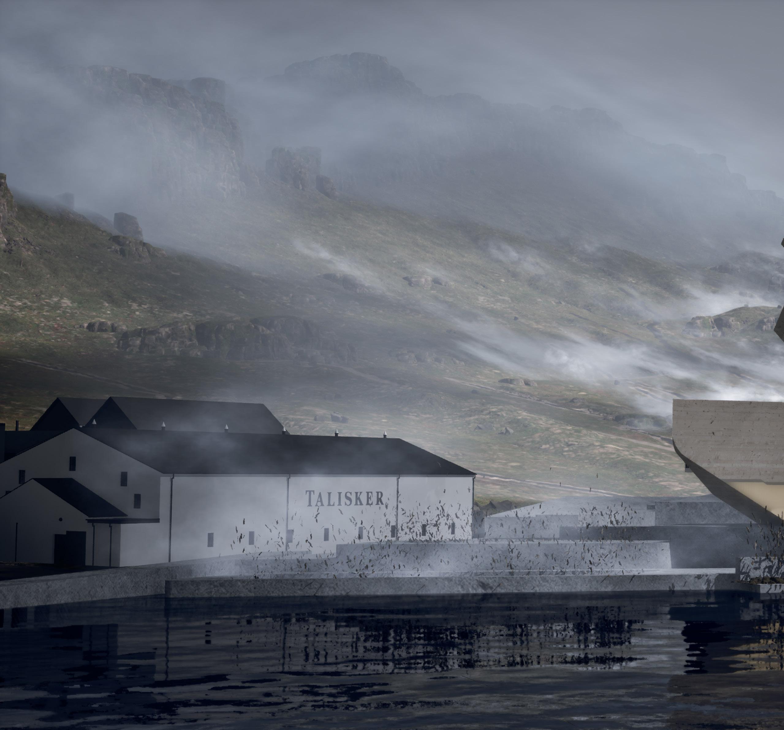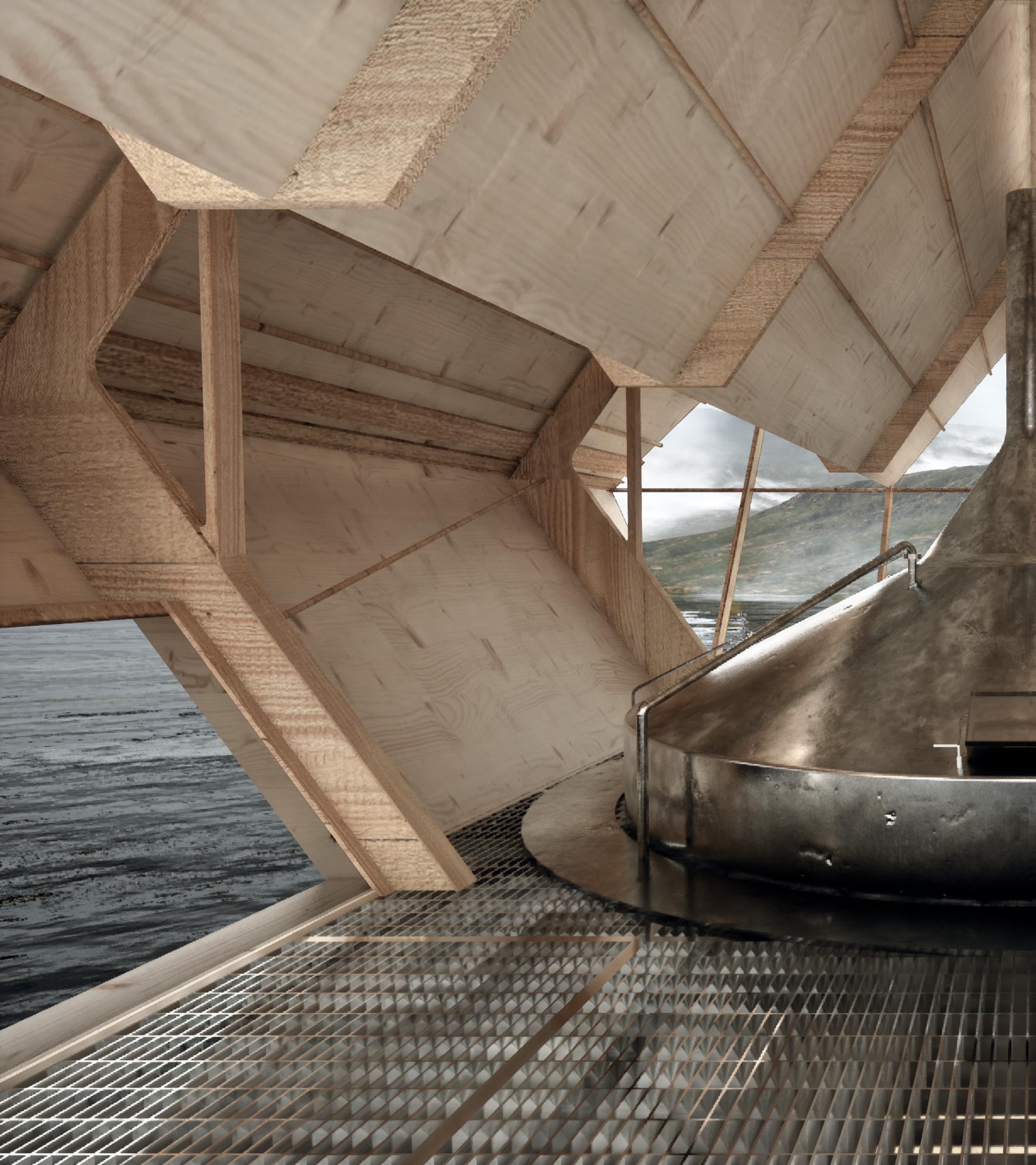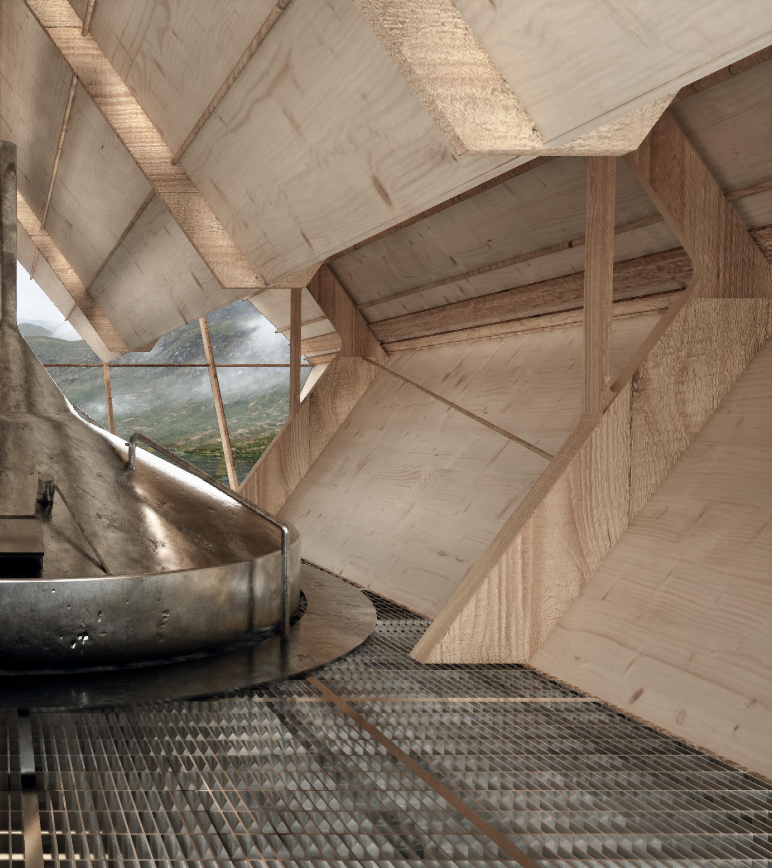 Whisky distillery as an orchestrated interplay of nature, materiality, and the sublime, where sculptural wooden forms dissolve into the mist-laden landscape.
