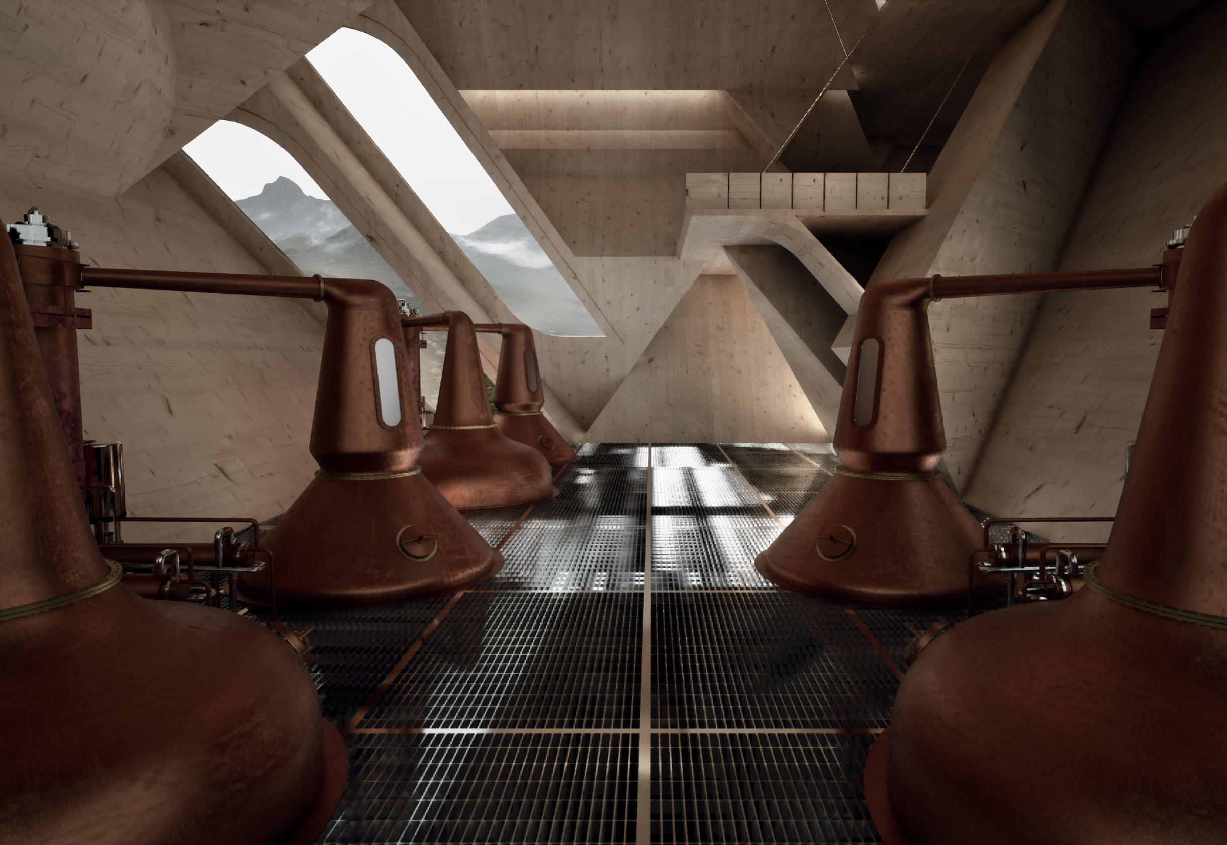 Inside, the distillation process unfolds as a spectacle, visible from a corridor above where visitors can observe the stills at work. The bright, luminous interiors stand in deliberate contrast to the misty and somber landscapes of Skye, using light to articulate notion of sublime obscurity—where clarity and darkness coexist to evoke wonder and astonishment.