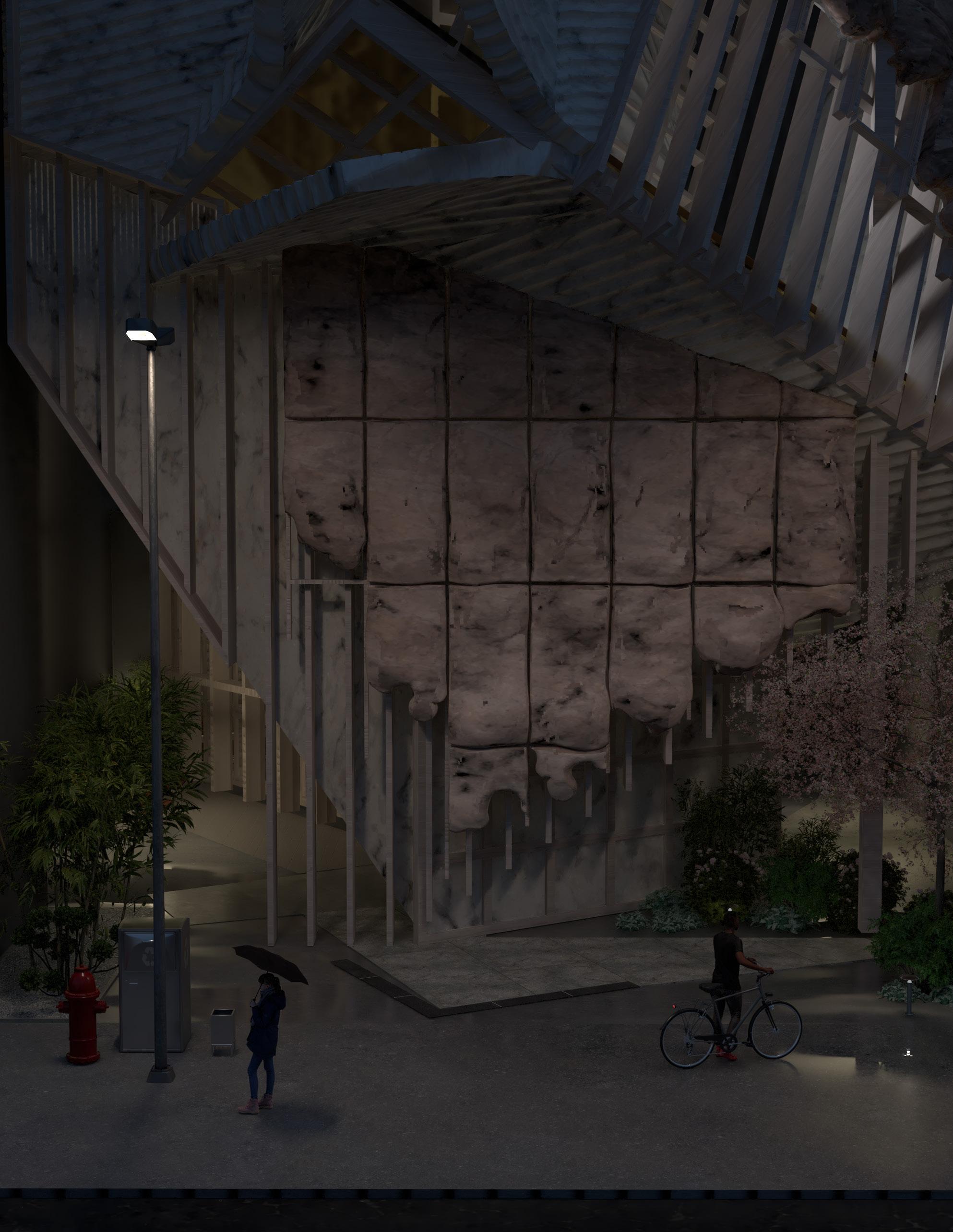A reinterpretation of Bologna’s porticos as dynamic civic spaces that evolve with climate and time, blurring the boundary between architecture and nature through material aging and environmental responsiveness.