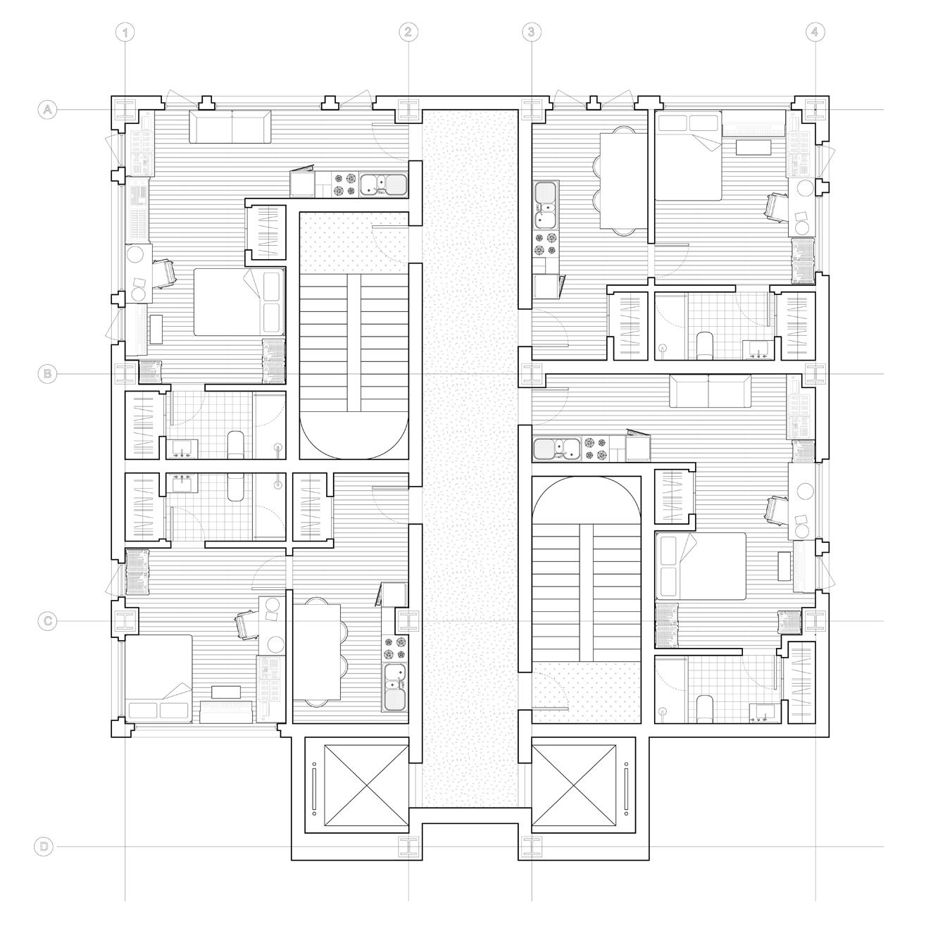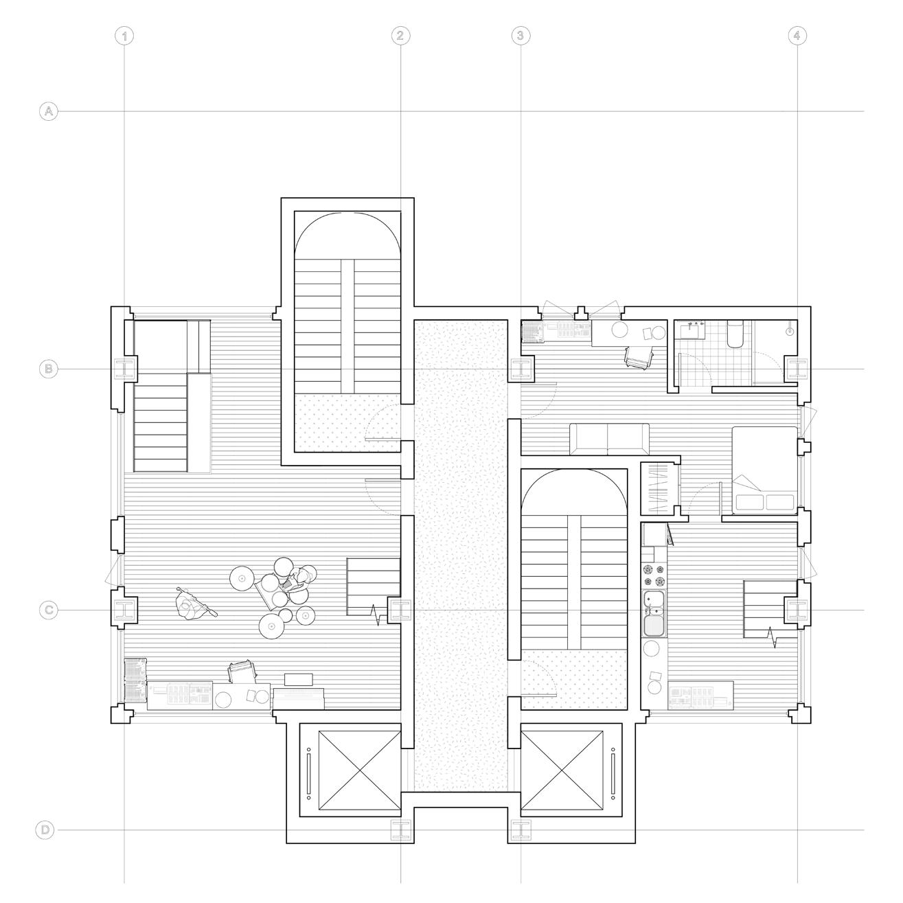 The second-floor plan accentuates a strategic corridor layout that ensures seamless circulation throughout the space. The corridors are broad and run parallel to the building's exterior, granting access to various ancillary rooms and central areas, which are likely to include functional spaces such as offices or meeting rooms. The layout is engineered for efficient navigation, leading residents and guests through a journey punctuated by visual connections to the courtyard. This design choice underscores the corridor not just as a passageway, but as an integral component of the building's experience, inviting pauses and interaction, rather than merely being transitory.