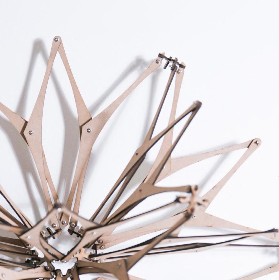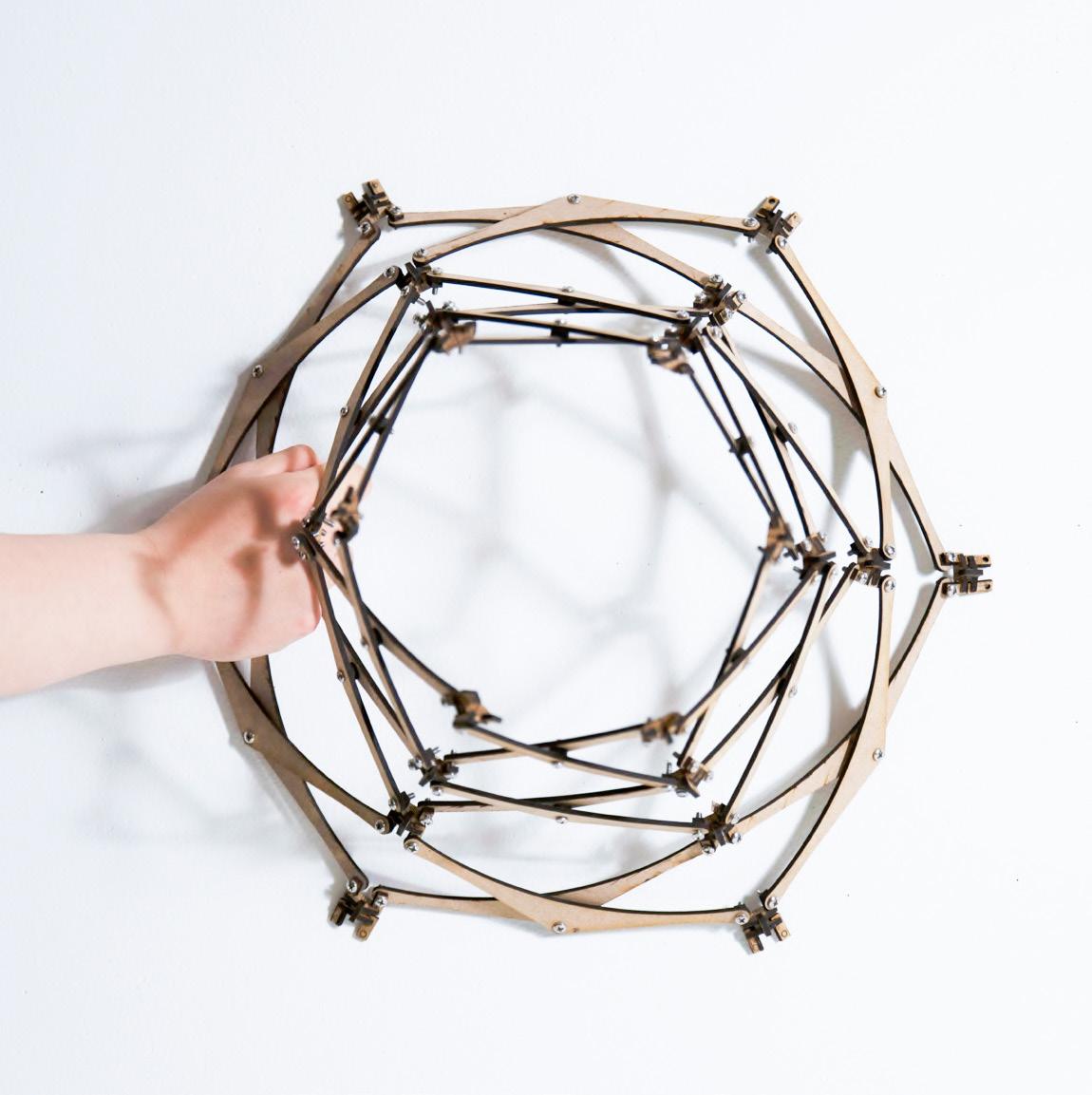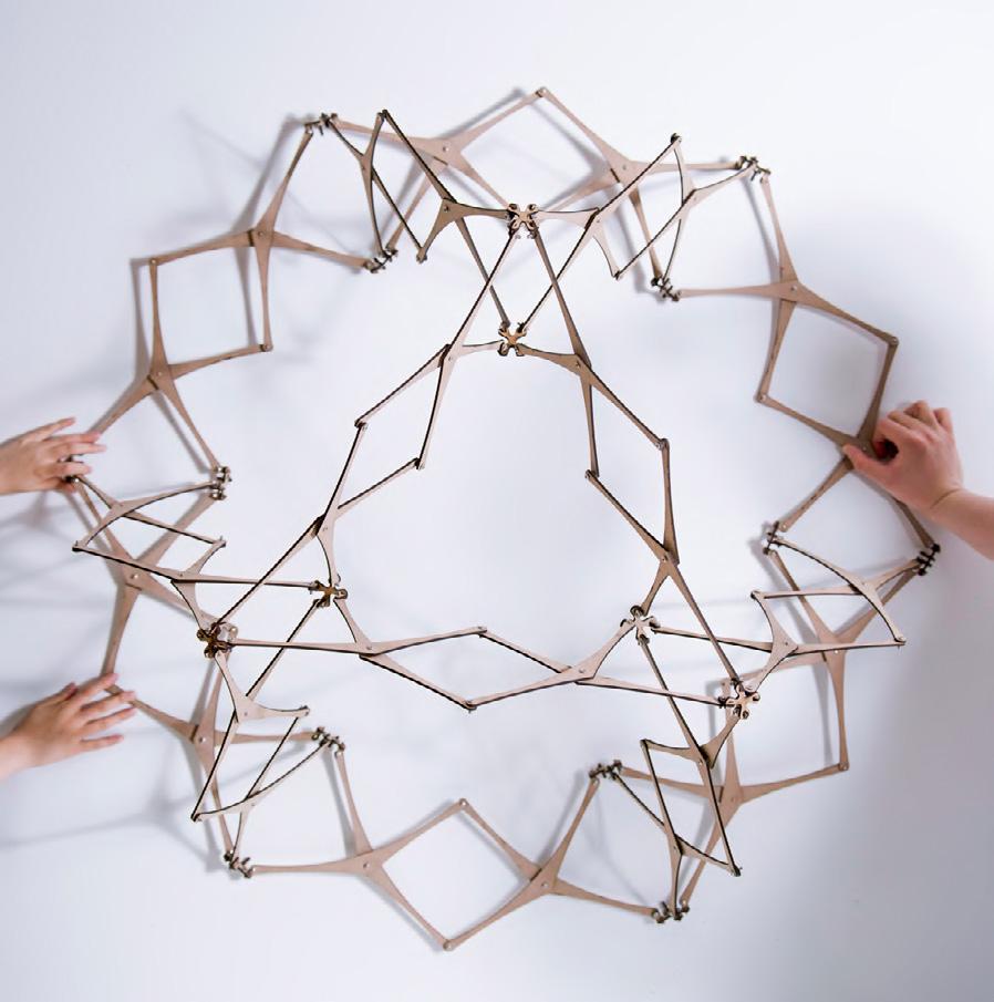 The system illustrates how computational design has guided the precise arrangement of joints and connectors to facilitate motion. The layered composition of the structure is visible, highlighting its three-dimensional form when fully expanded.