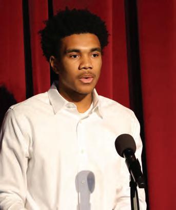 Student and Faculty Panel, from left: Kara Harris, Raya Stern ’28, Sid Vadnerkar ’26, Erin Patterson ’26, Clemente Pappoe ’26, Andre Gibson-Starks, with Head of School Andy Rodin at right