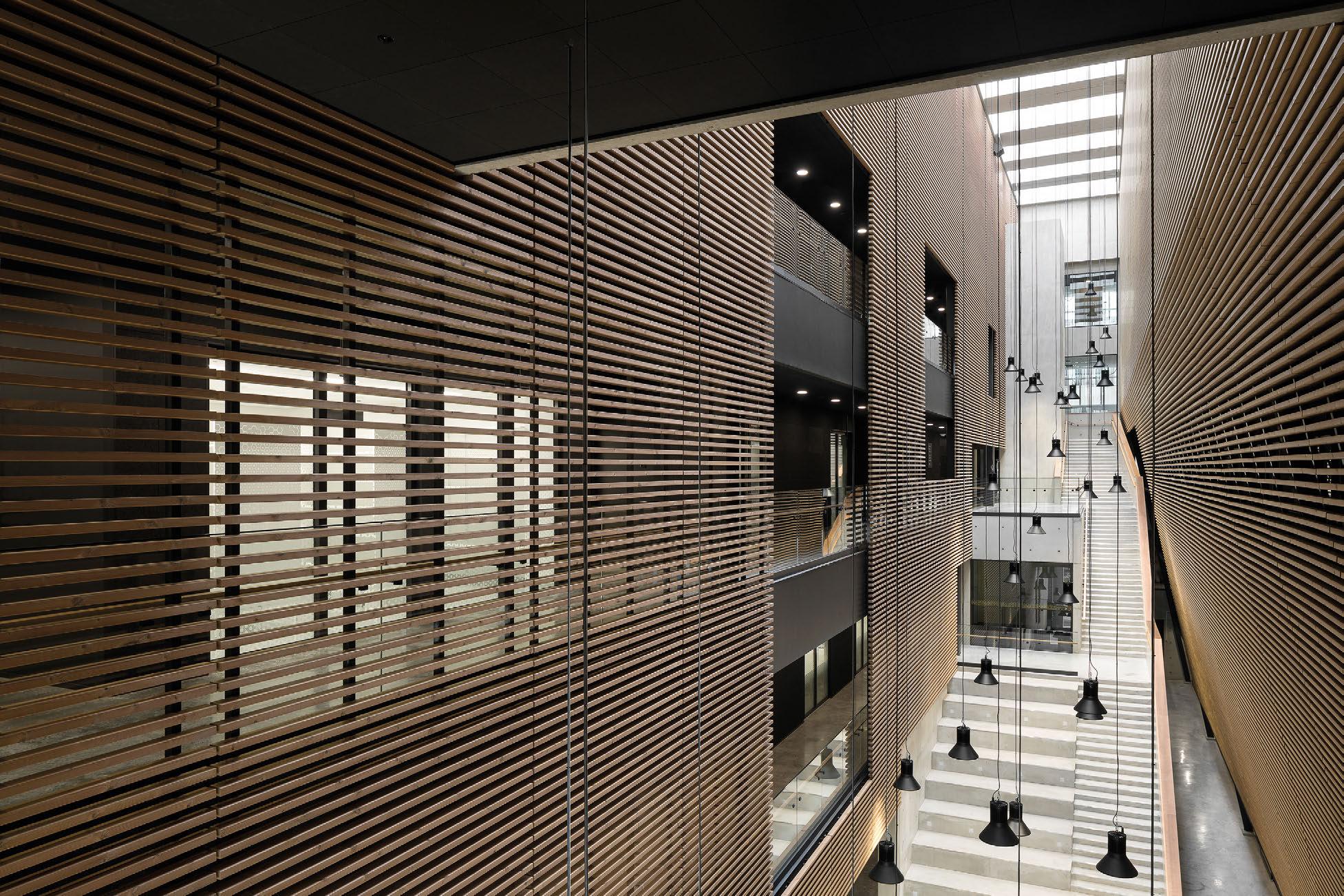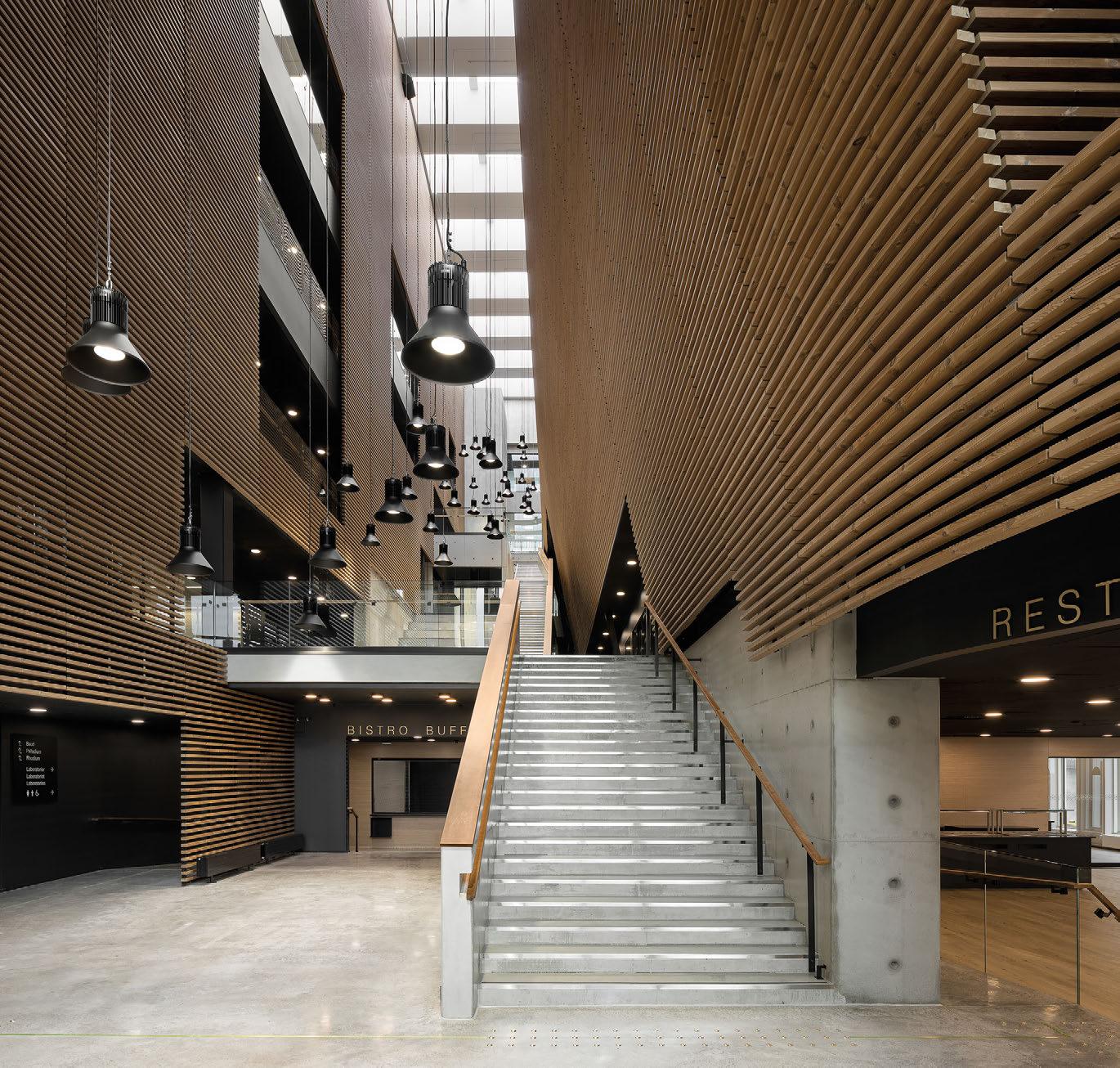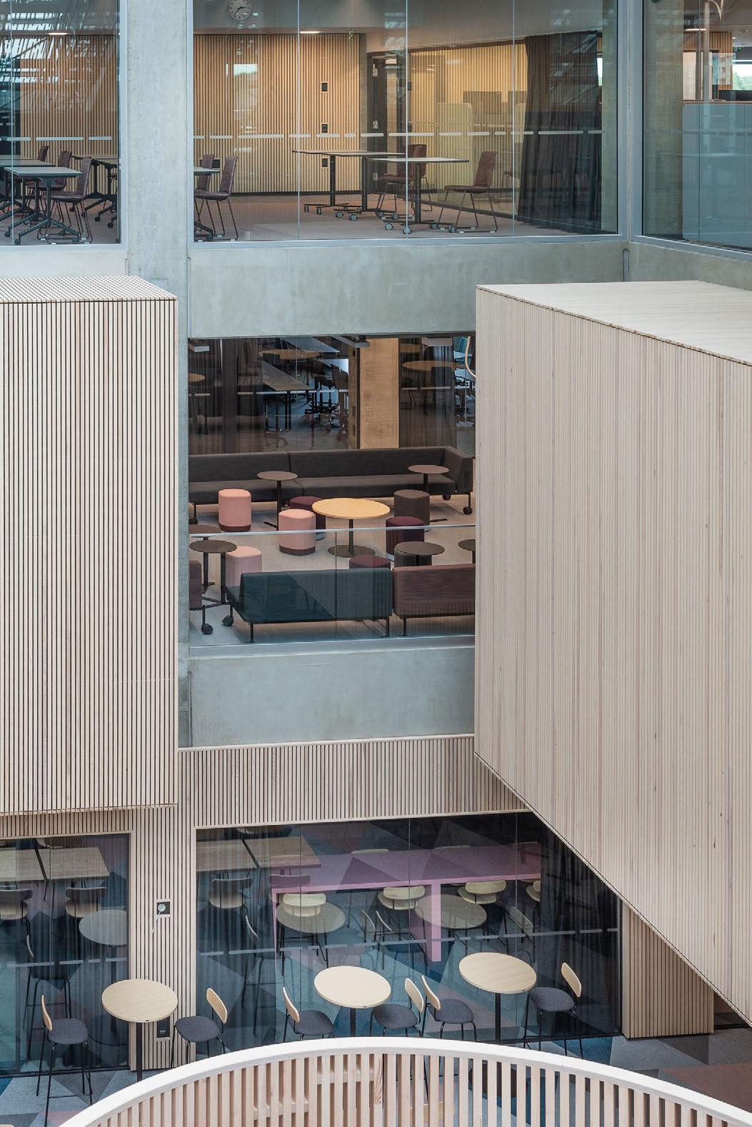The design work was steered by an idea of the lobby as a shared meeting place of the entire campus area. When you step in through the main entrance, you are enveloped by the timber battening lining a full-height atrium that soars all the way up to the skylights. The concrete stairs and landings wind upwards from the entrance level to the fifth floor, following the rhythm and direction of the rise up the Yliopistonmäki hill.