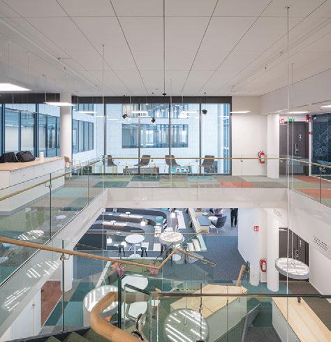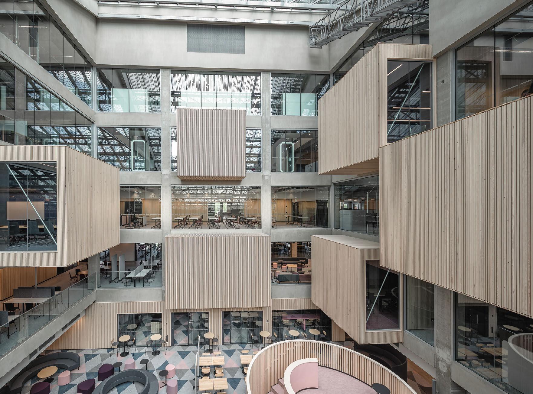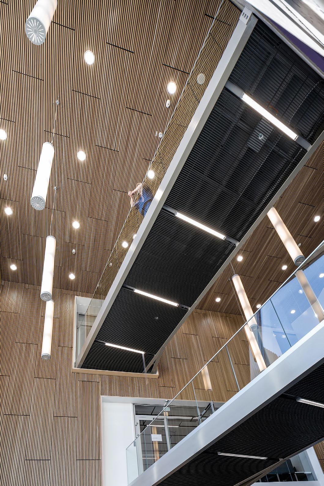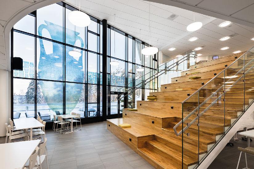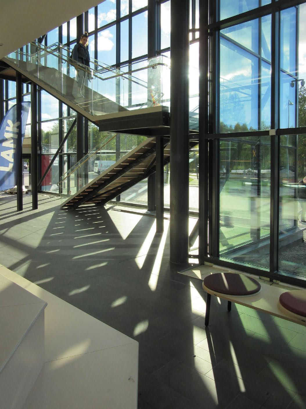The design work was steered by an idea of the lobby as a shared meeting place of the entire campus area. When you step in through the main entrance, you are enveloped by the timber battening lining a full-height atrium that soars all the way up to the skylights. The concrete stairs and landings wind upwards from the entrance level to the fifth floor, following the rhythm and direction of the rise up the Yliopistonmäki hill.