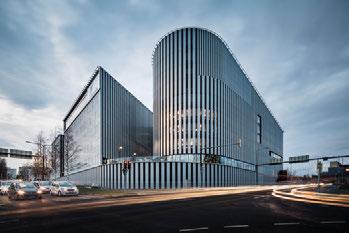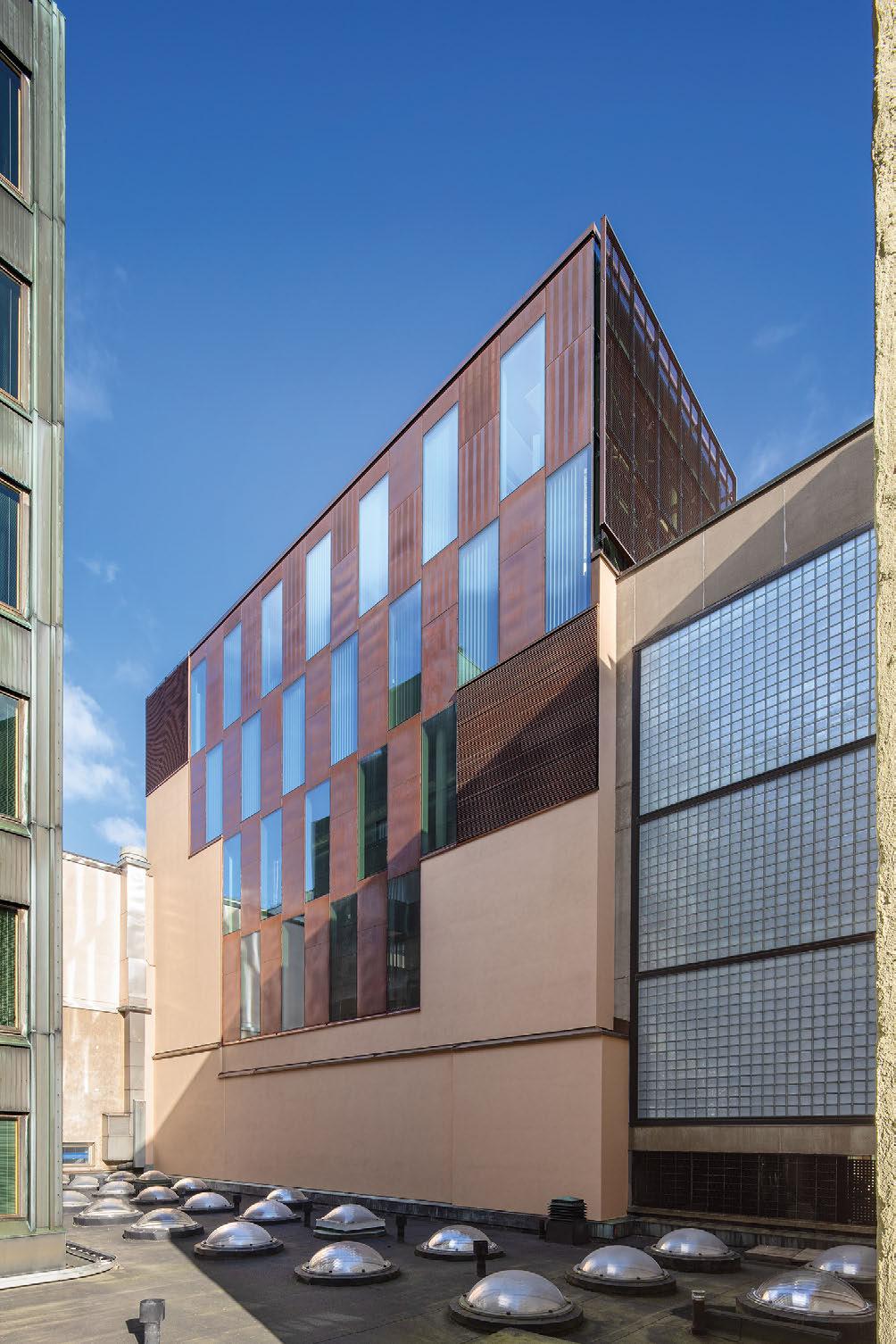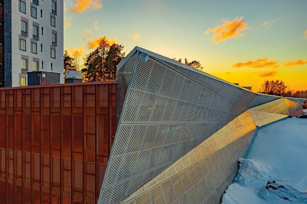 The metallic building glitters and breathes through its gills like a sea creature washed ashore from the deep. The ventilation rooms are concealed in the curved ceiling: the supply air is taken from the north, from the level of the roof, and the exhaust air is blown out from the “gills” of the wings.