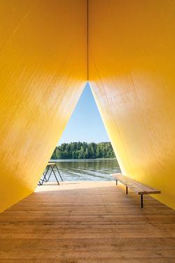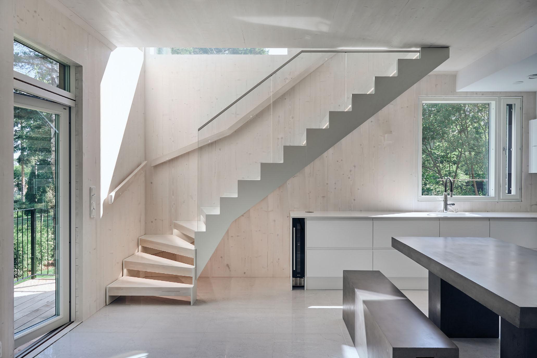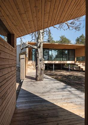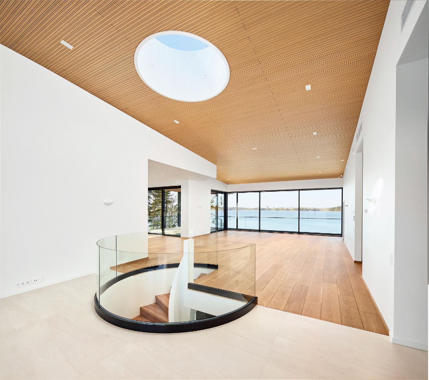 The form of the building was created by observing the site that was selected for it and the opening views. We also discussed how people would move in the building and around it. The structures and other timber materials are Metsä Group’s products. They are impressively present in the building.