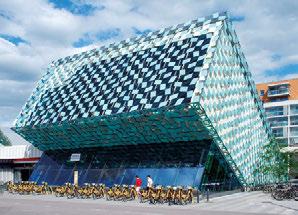 All facilities that have been meant for quiet working have been equipped with glass walls. The cafés are located further away, close to the roof terrace. Silk-screen printed glass has been used in the skylight of the building, which reduces the amount of incoming light. The office and learning spaces open up towards an atrium, where the wooden cubes create a fascinating atmosphere. The cubes are there for the acoustics of the building: they reduce the echo in the space. Also in other respects, the materials play an important role. Right from the beginning, the client hoped that the building would be made of concrete. The handmade Kolumba tiles are the material for the facade. The tiles link EduCity to the brick-built DataCity building. The ventilation plant room has been clad with an aluminium-magnesium alloy that creates a visual connection to the ICT building. There is a great deal of art in the building, which is an important part of the EduCity project and the other development projects of Turku Technology Properties.