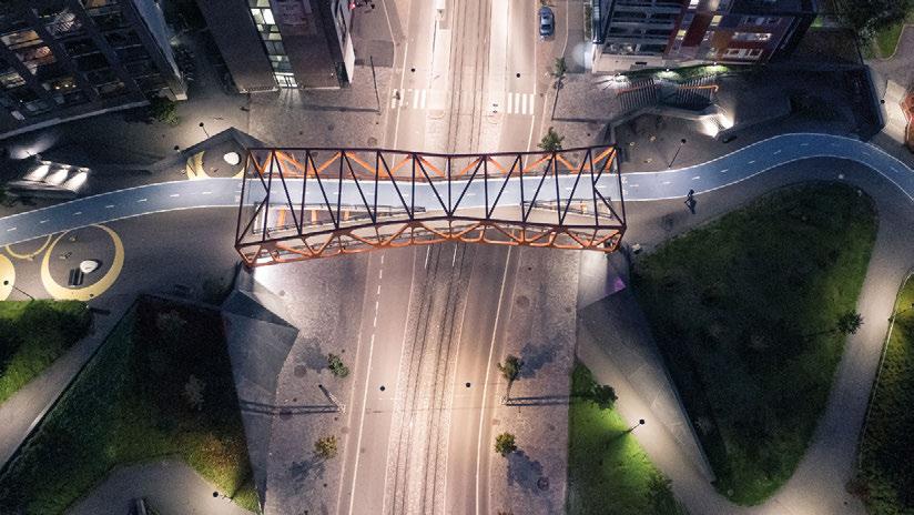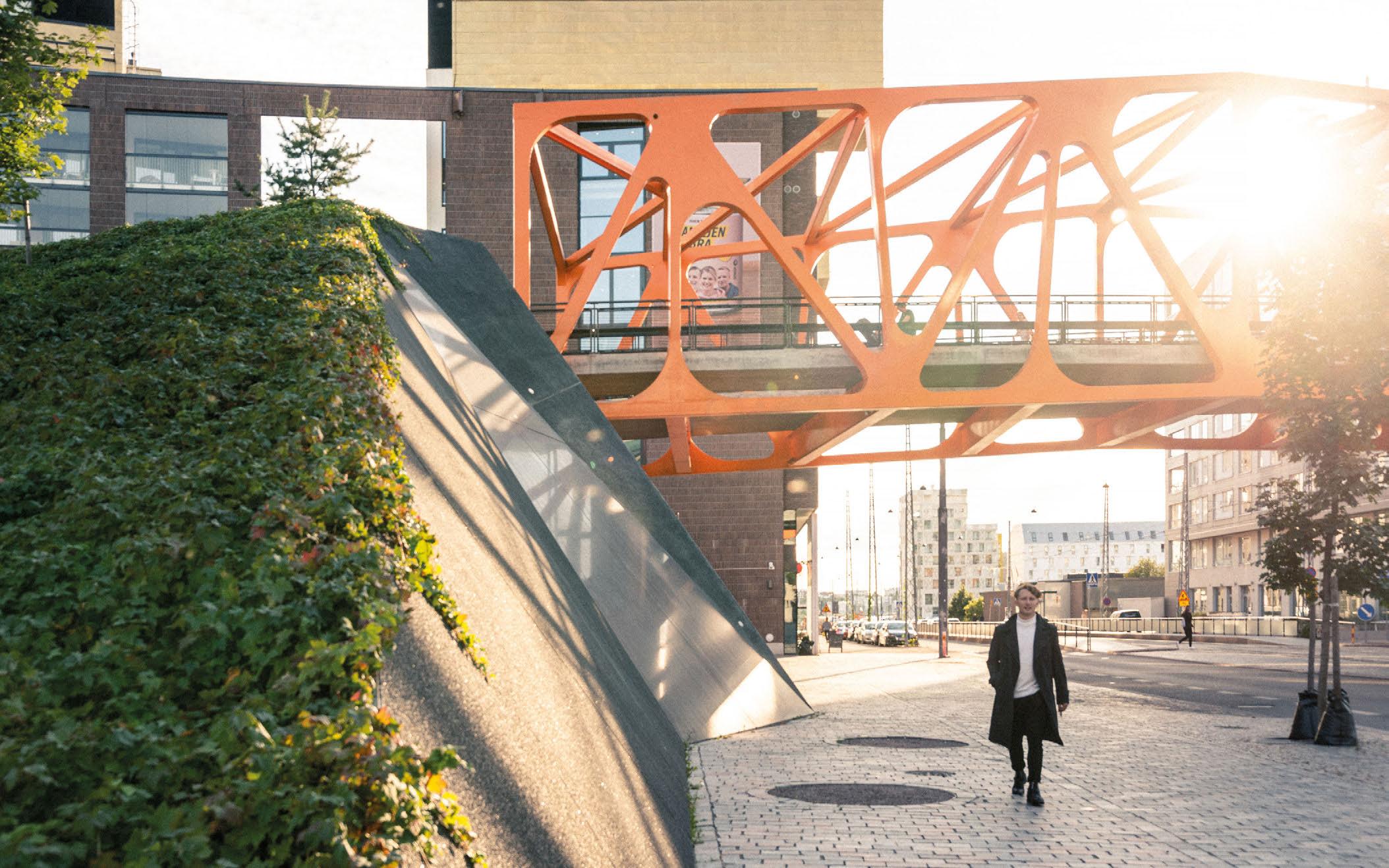 The strong bridge elements are landmarks in the Jätkäsaari district. The bright orange steel bridges of lattice construction connect the different parts of the lush park, crossing Välimerenkatu Street and Länsisatamankatu Street. The black exposed aggregate concrete in the folding, art-bearing retaining walls – which are more than five